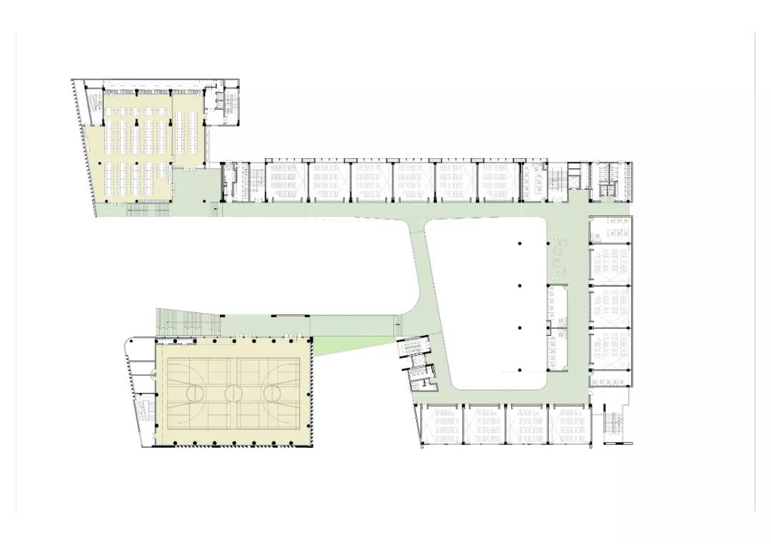 第三庭院空間:通過中部非正式功能空間的錯疊并置,與南北教學(xué)樓共同形成了內(nèi)向型圍合式教學(xué)疊院。中部功能聯(lián)系體底部兩層架空,并與地下多功能廳的下沉庭院,構(gòu)成了地上、地面、地下多重空間連續(xù)和流動;錯落的功能盒子局部架空形成的空中活動平臺,為每層學(xué)生提供了寶貴課間十分鐘的活動和交流場所,引發(fā)孩子們互動玩耍、學(xué)習(xí)交流的熱情。