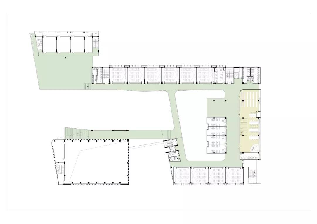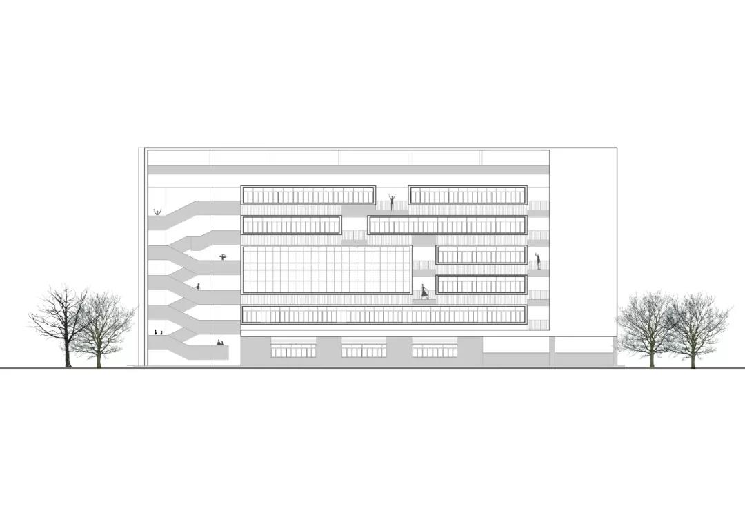 中間聯(lián)系體將面向庭院的教學(xué)辦公區(qū)的外部走廊與非正式空間通過一系列的活動路徑串聯(lián)起來,活動路徑在室內(nèi)外、上下層之間相互交疊,促進交往、交流的發(fā)生,同時強化了分層的模糊性、垂直空間滲透性和便捷的交通聯(lián)系。