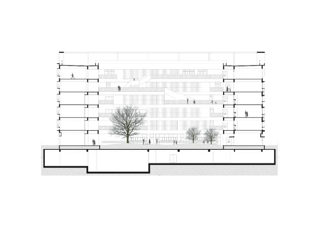 基于高容積率的特殊性,為了土地集約高效,校園建筑以“金角銀邊”的原則沿邊展開布置,同時將300人的多功能報告廳置于地下,釋放更大的庭院地面空間,使得每棟建筑單體享有良好采光、自然通風(fēng)和優(yōu)越的視線與日照間距。