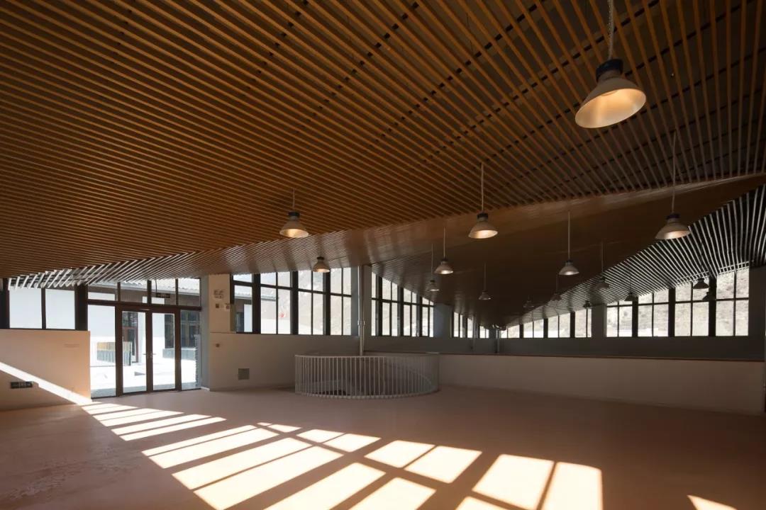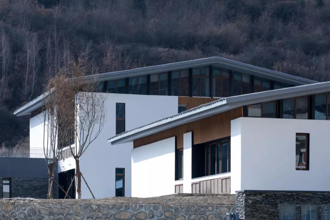 阿壩九寨民居融合了藏族碉樓和川西民居的特點,下部夯土壘石,上部木構架露明,建造體系清晰。設計以此為原型,主體為鋼筋混凝土框架,下部磚石填充,上部設置高側玻璃窗,形成“下重上輕”的材料關系。