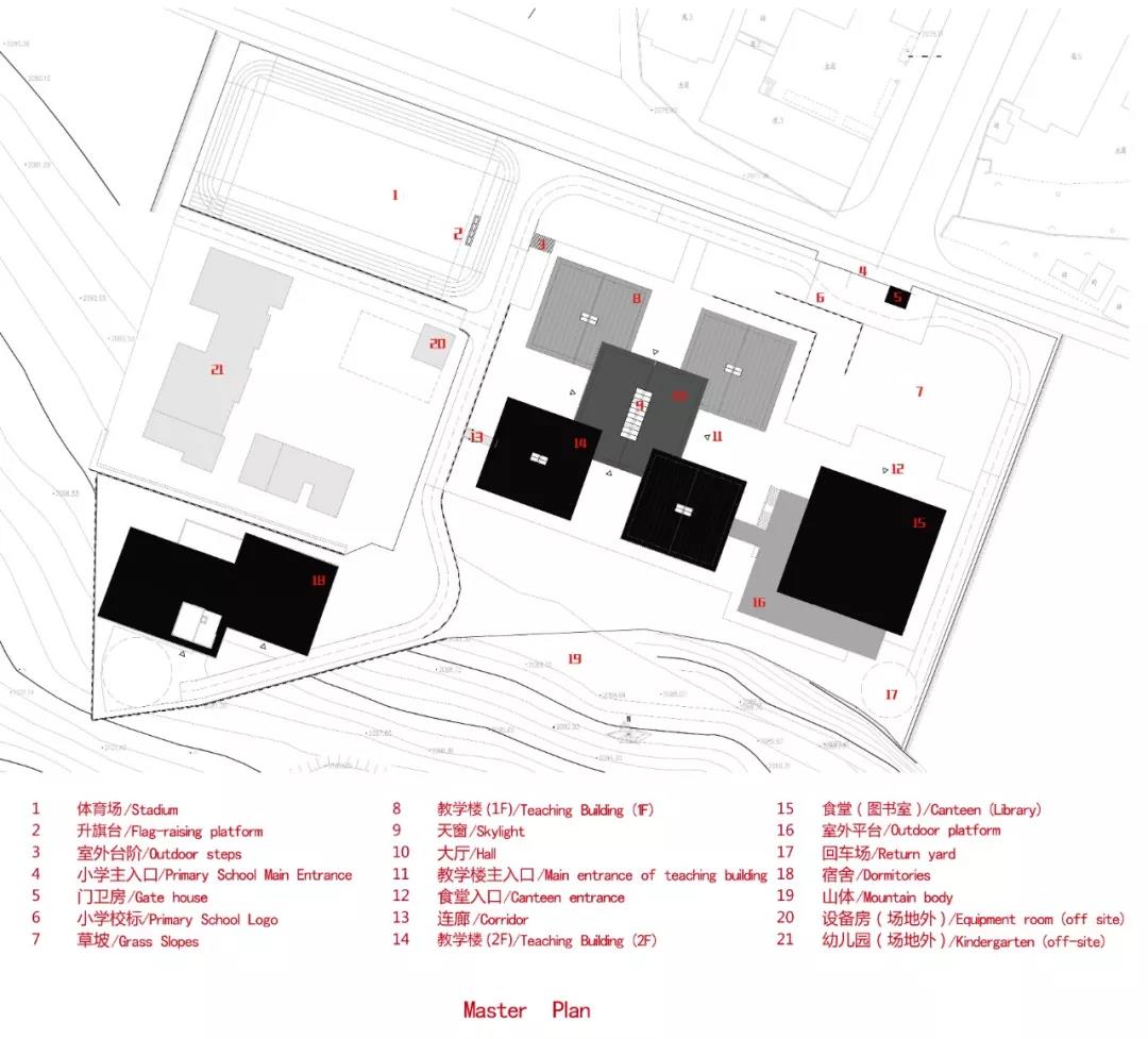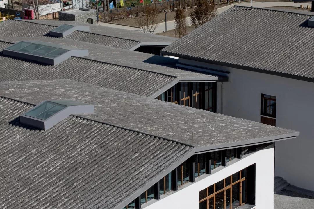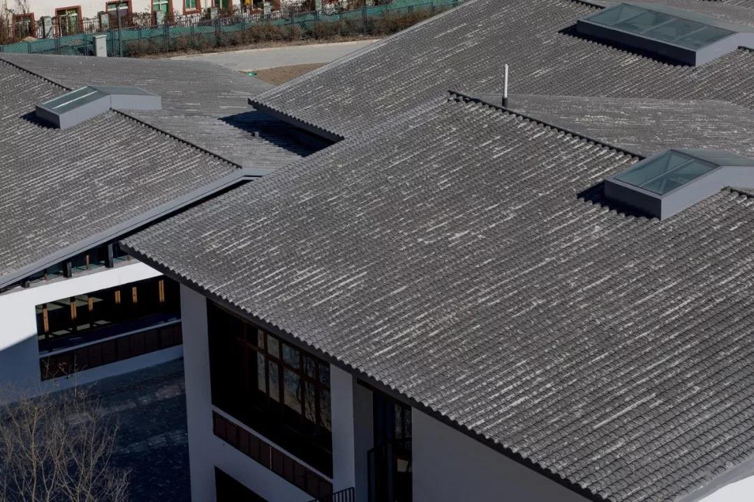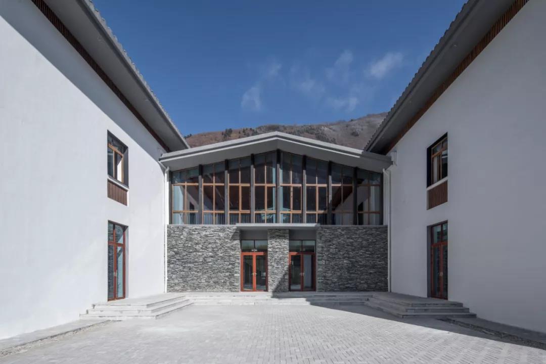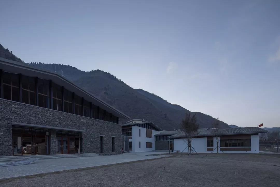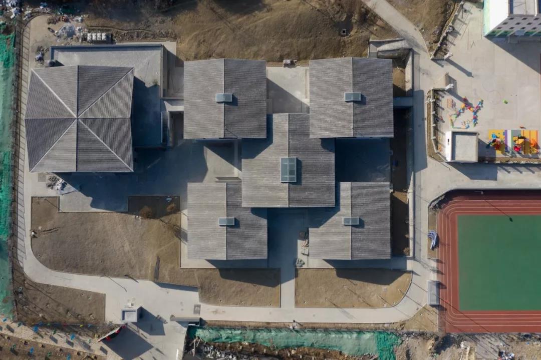 場地位于山地河谷,設計利用現有的緩坡地形,分別設置校園入口、教學區、運動場,三個不同標高的臺地串聯。我們借鑒當地藏族村寨的布局特點,將建筑拆分為多個坡屋頂體量的組合,山墻向陽,前低后高,層疊起伏的青瓦屋面與大山輪廓相呼應。建筑平面圍合出多個半開放的三合院空間,將山景納入其中,建筑與環境融為一體。