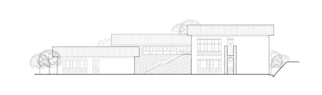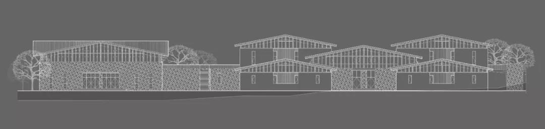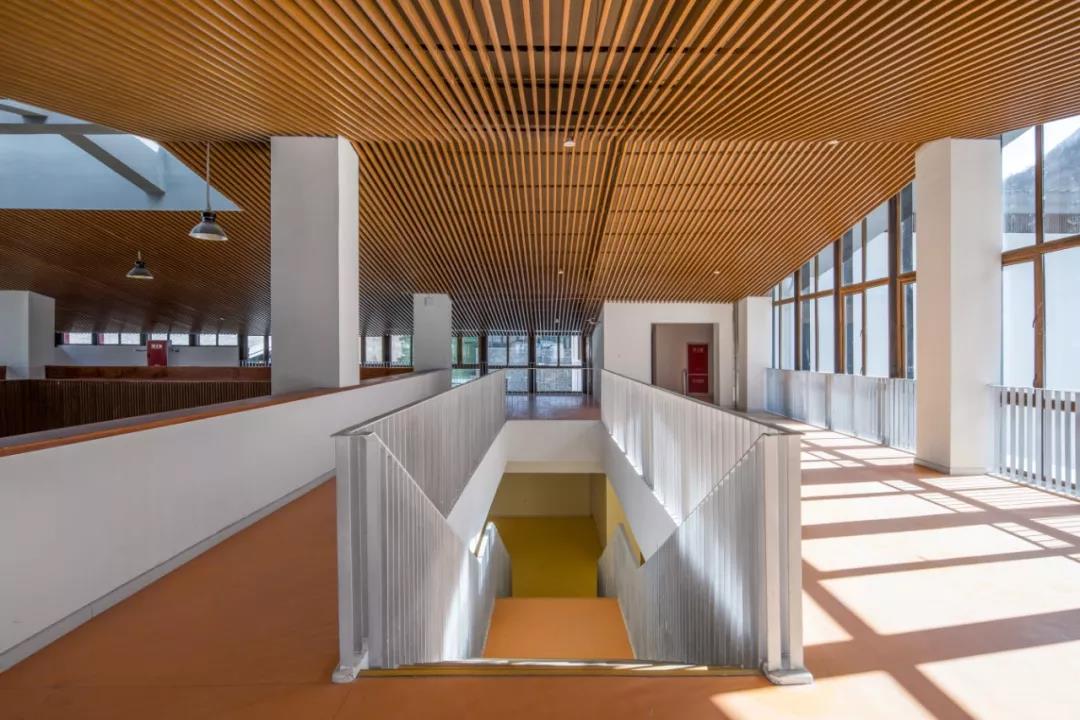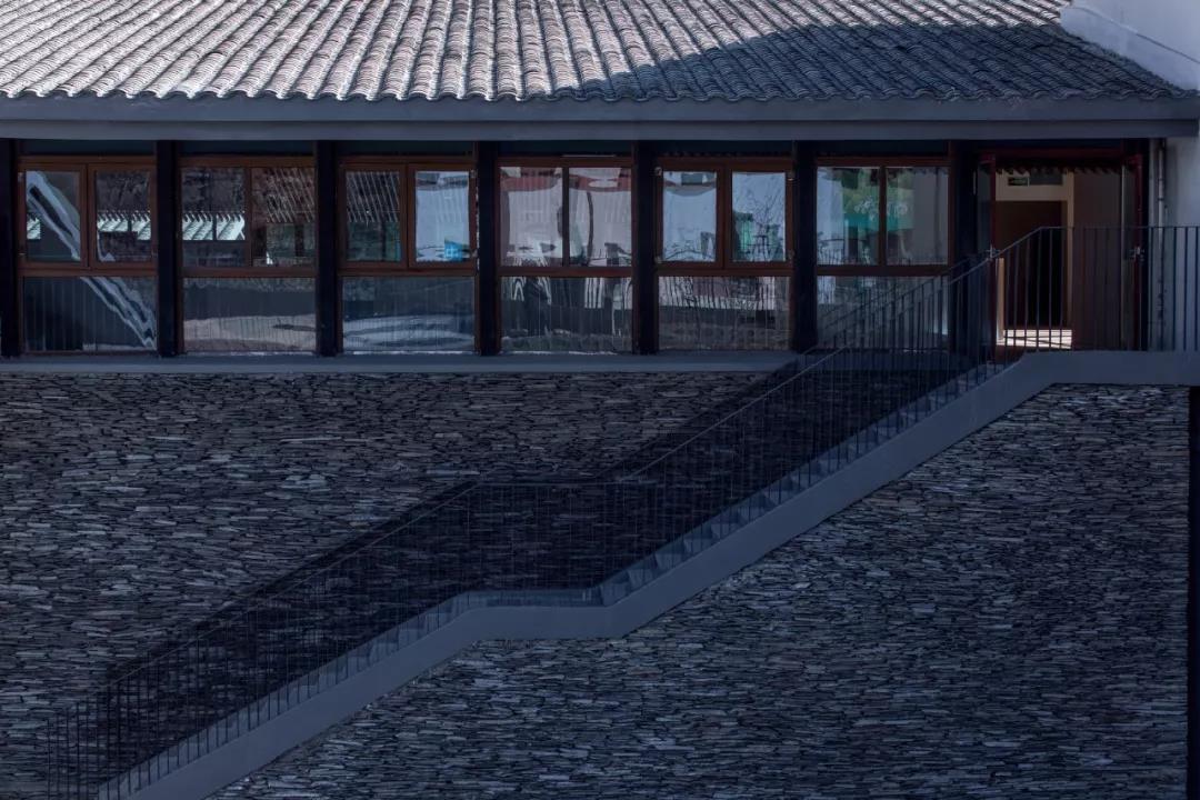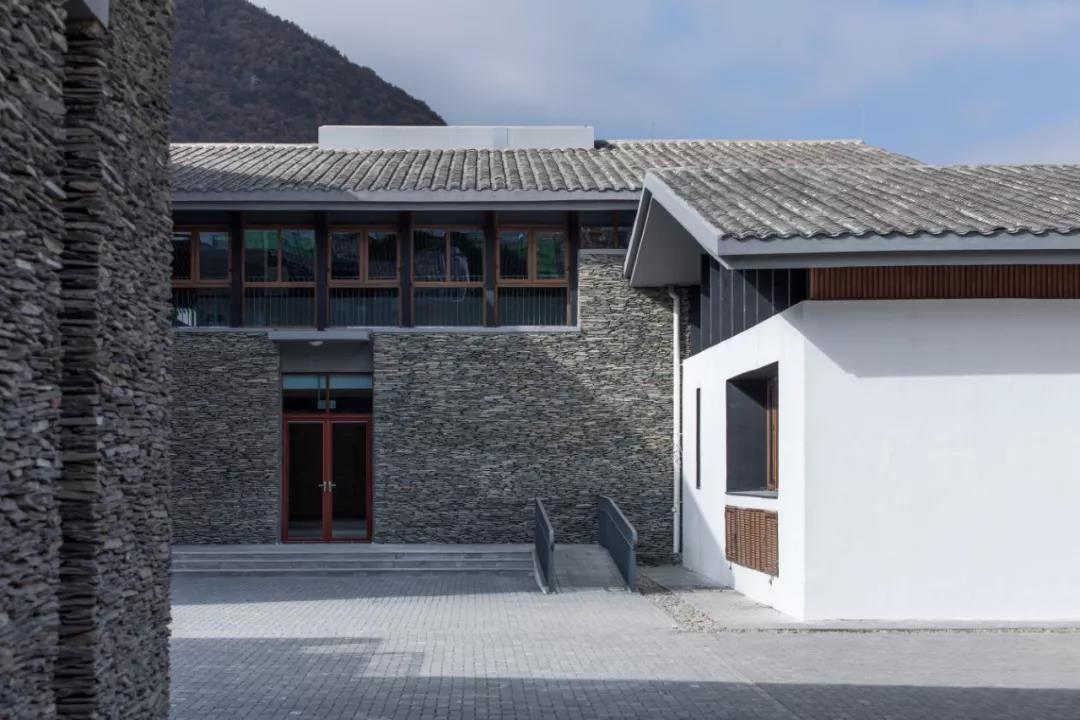 校園大廳和食堂的外墻面,嘗試片石與混凝土塊混合砌筑的方式,通過設置雙向拉結鋼筋,加強構造連接。建筑外觀的灰色片石、白墻深窗、木板墻身、小青瓦屋面,在材料和構造層面延續了當地的建造傳統,增強孩子們對家鄉的記憶和情感。
