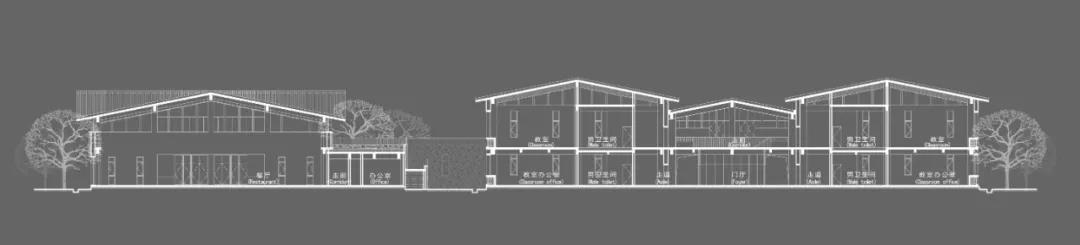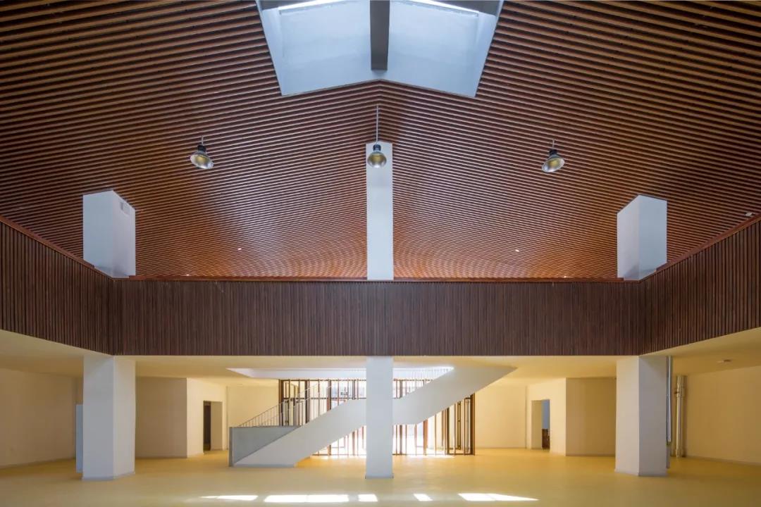 食堂圖書館作為一個單獨的模塊,采用了與教學樓雙坡屋面不同的四坡十字形屋頂,內部兩層空間上下連通,增強功能的開放與互動。