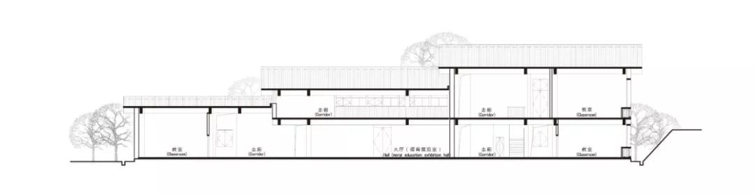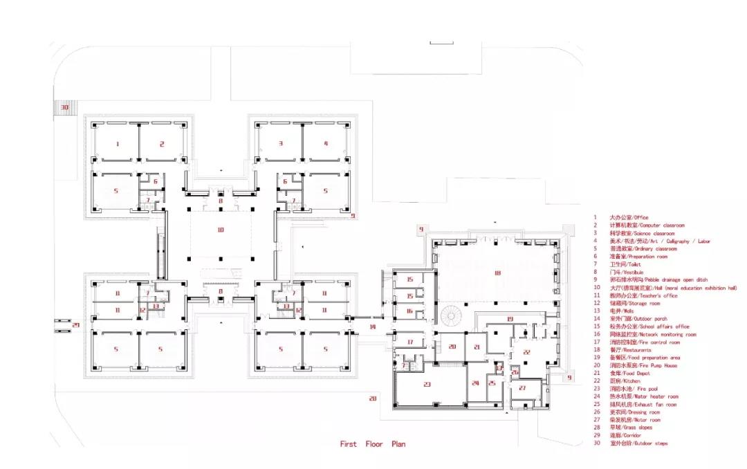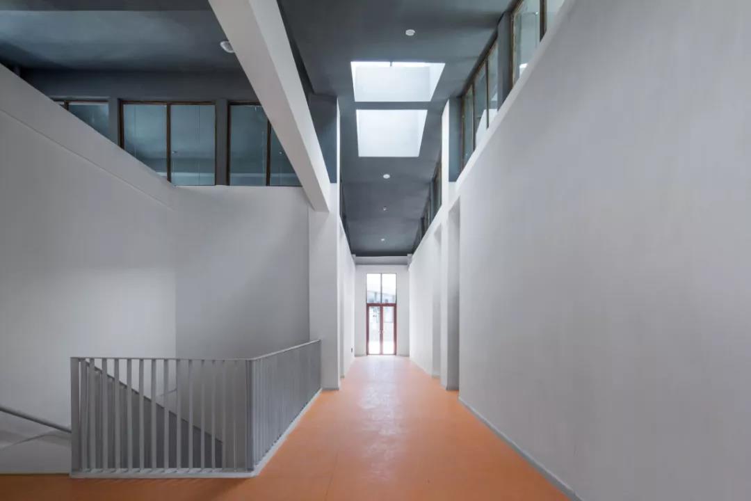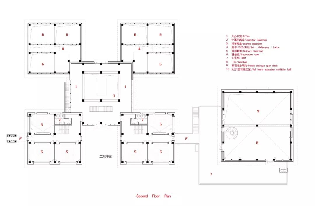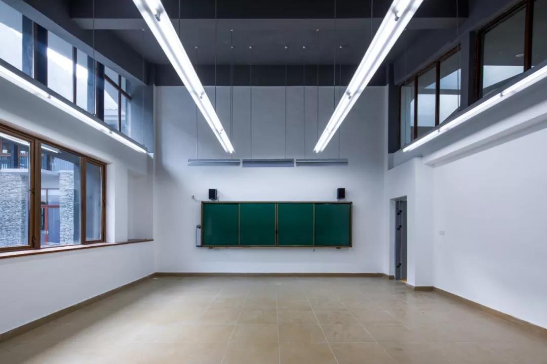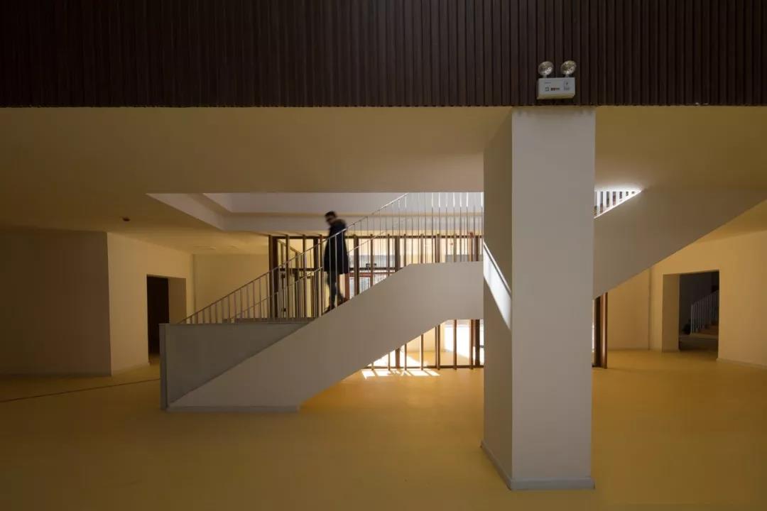 中央的校園大廳是人流匯聚的核心。大廳45度對角方向分別與四個教學模塊連接,南北和東西入口則分別通往四個庭院,便于室內外活動的互動。校園大廳既是門廳,又充當多功能廳,可以舉辦演出、講座、展覽等公共活動。