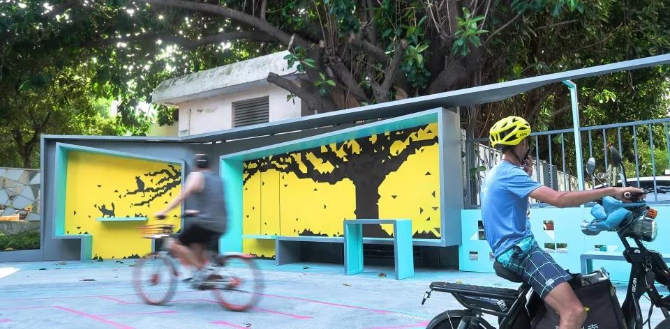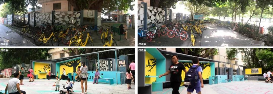 場地是一處內向而封閉的角落空間,場地外部邊緣被綠化帶完全隔開,從城市的界面難以被發現,內部同時被管網柜、樹木、圍墻所包圍,顯得非常陰暗與消極,尤其上下班高峰期都被大量共享單車所占領,場地沒能發揮更大的公共服務價值。