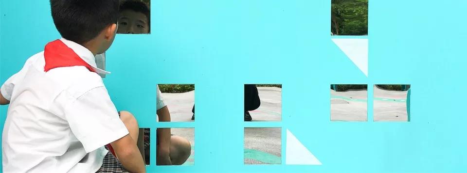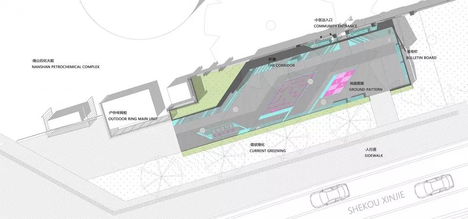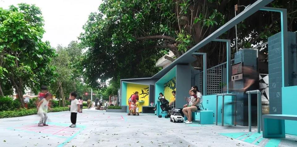 我們希望社區居民與場地產生互動,而不僅僅是匆匆而過的社區出入口廣場,設計通過劃分交通與停留的區域,在流動的空間內創造“定格的風景”,流動中的人群與被定格的風景,共同構成場地獨特的記憶點,利用現狀小區圍墻植入一條連續的折廊整合空間,把稍縱即逝的風景定格在墻框內,而往來人群成為了動態的風景,被吸引,或停留,或行走,或閑座,或交談,與背景墻框形成動態與靜態交融的連續畫面,也成為了城市界面的一抹色彩,從而改變場地原本功能單純一且封閉的角落空間,成為供鄰里聊天、閑坐等候、兒童片刻玩耍,來往人群休息的公共開放空間。