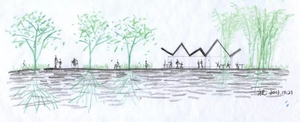 隨著浦江西岸的貫通開發,有著百年歷史的龍華機場被改造成城市干道旁的跑道公園。在這條南北縱向的城市綠化帶中,我們設計了一系列為公園和社區服務的小建筑。云錦路活動之家是這個系列里比較集中的一處聚落,由社區之家、咖啡小屋、法南餐廳三座建筑組成。
