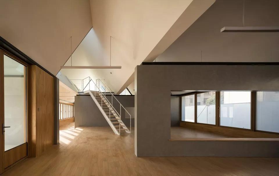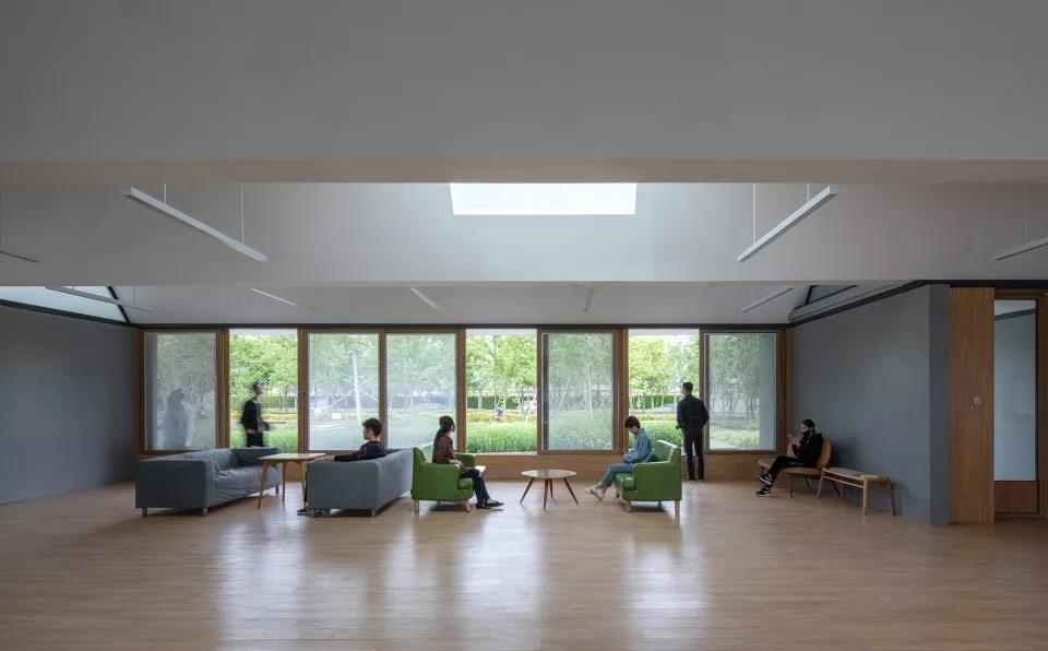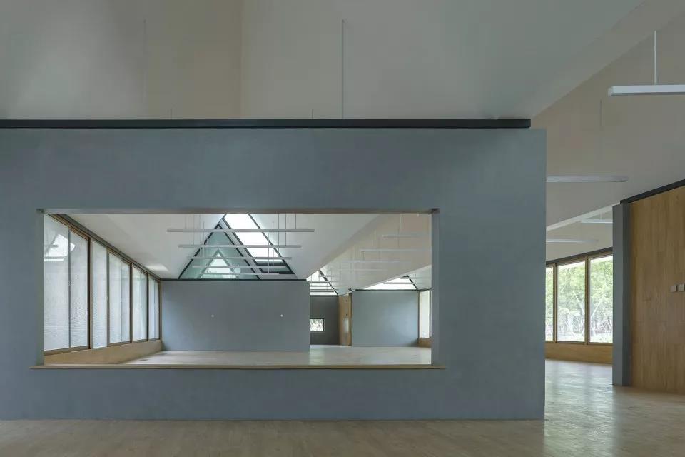 活動之家是東西朝向的建筑,西曬較強,混凝土墻之間的東西外墻采用大面積玻璃窗,窗臺高度45厘米,玻璃內置可調節百葉,以控制光線的進入,為室內創造朦朧均質的光。窗框和窗臺為木色鋁合金,為白色屋頂和混凝土墻構成的素樸室內增添了一抹溫暖的感受。