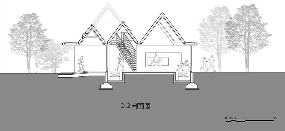 這樣,自由分布的混凝土墻支撐起一個雙坡屋頂的集群,大小屋面交錯嵌套,生成了高低起伏、櫛次鱗比的形態,如同一個聚合的小村莊。整個建筑在橫向剖面上的近人尺度源于對傳統居住空間的日常體驗。