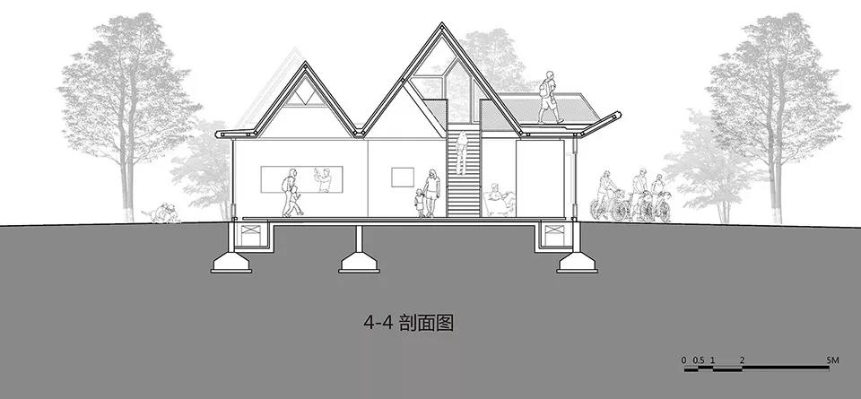 如同傳統的家屋建筑一樣,確定了統一的檐口高度(2.8米)和屋頂坡度(53°)之后,根據不同的房間進深就可以決定不同的屋頂高度。建筑的開間則根據場地和空間的需要來劃分。