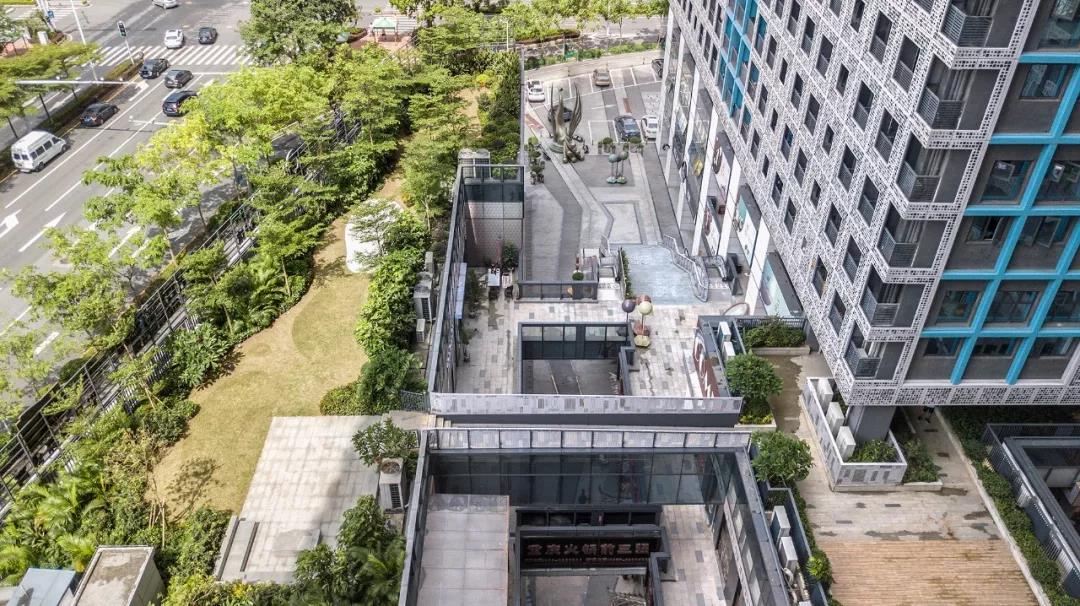 為了保證每個單元擁有最佳景觀視野,我們把一棟矩形平面和一棟L型平面的相對面做到最小,使其與三角形基地契合,同時可以盡量減少彼此的視線遮擋。為了打造“多首層,多臨界面,多元化功能流線”的概念,我們設計了露天退臺式商業內街,使人們在購物的同時享受更多的綠意與陽光。