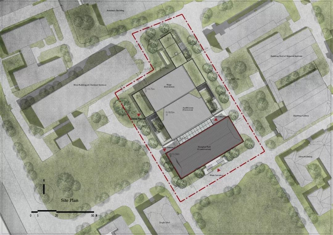 另一方面,相輝堂原有的容量已經無法滿足禮堂的功能要求。擴建建筑為一座751座的多功能劇場,由老相輝堂作為其前廳,共同構成復旦大學的新禮堂。擴建建筑在與老建筑協調共生的前提下,既滿足了觀演、學術交流、會議活動的功能,又保留了復旦舊有的校園格局,復刻了一種歷史記憶。