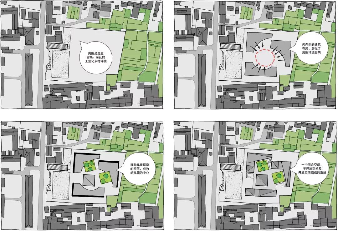 針對這種現(xiàn)狀,我們決定制造一個“群山環(huán)抱”的“谷地”:以多層建筑三面圍合出一個內(nèi)向空間,為孩子們在園內(nèi)生活、玩耍和學習時,阻隔來自外界的大部分嘈雜;同時,仍沿用組團形式,適度分解幼兒園的總建筑體量,將尺度降到不至于讓孩子感到壓迫的程度。