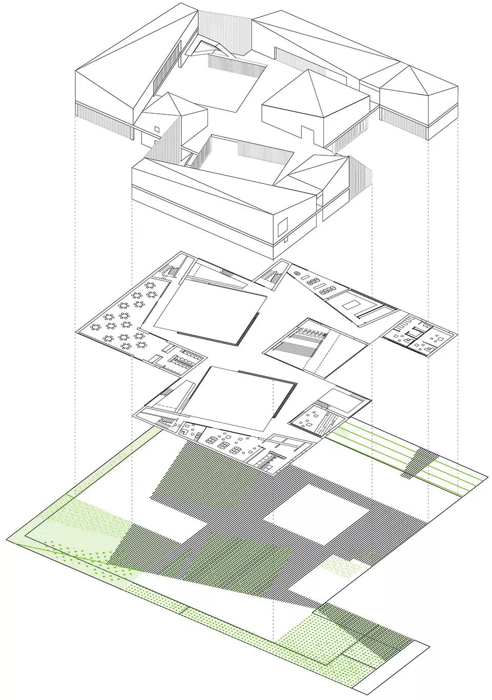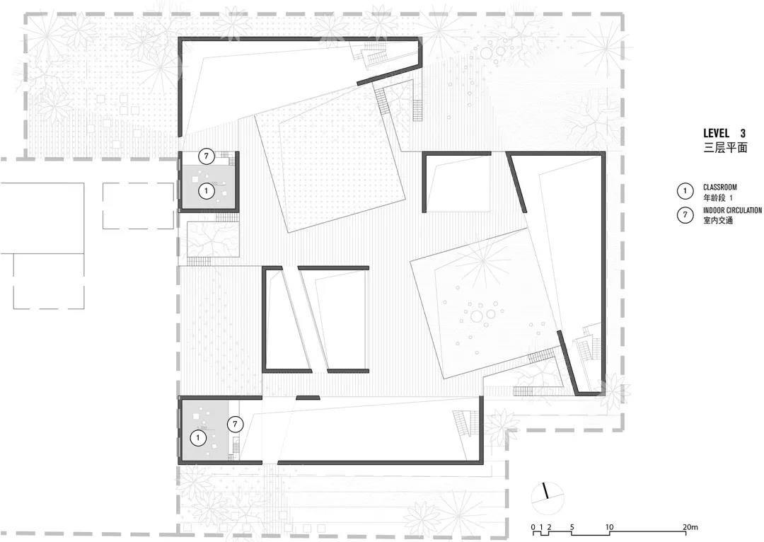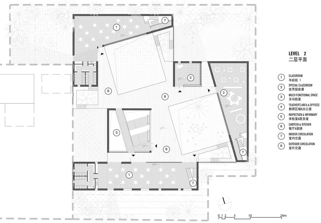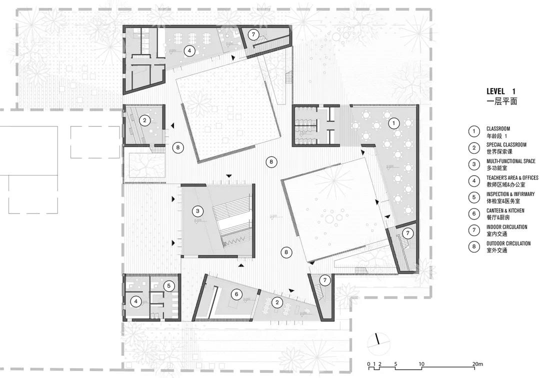 在布局上,“山谷”四周的建筑容納了不同功能,但各自獨立,我們特意將大部分交通空間挪到室外共享的大院里。這樣,孩子們在進出各個學習、娛樂或生活空間時,總要經(jīng)過中庭,大大增加了他們進行戶外活動和自由交流的機會。
