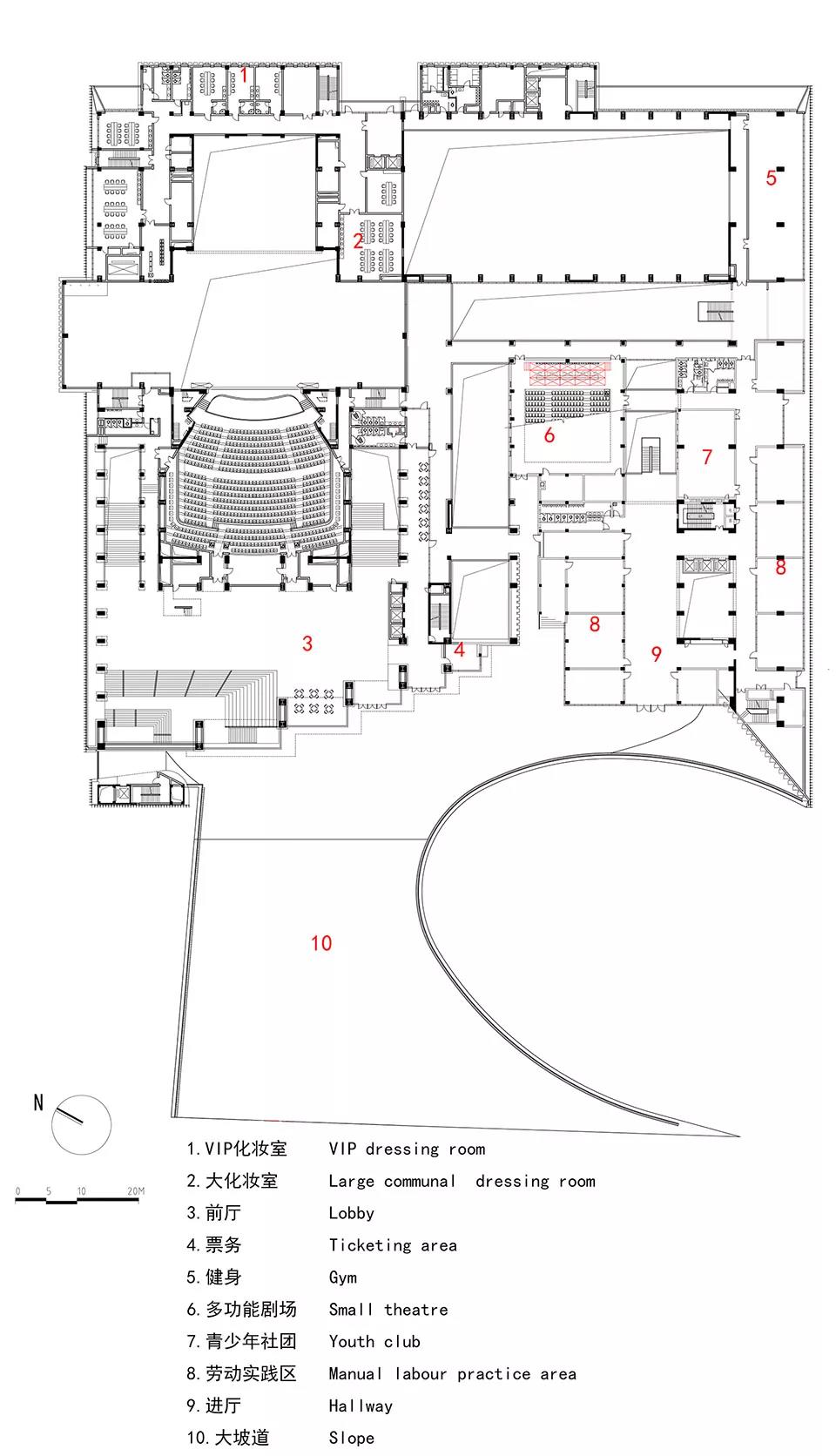劇院、健身中心、青少年宮三大功能區塊圍繞立體庭院呈合院展開,合院的第四面則是巨大的主入口空間。主入口巨大屋頂如云垂天際,入口下巨大的灰空間正是源于戲臺、祠堂等江南傳統的公共空間模式,十分適合江南地區的公共文化活動要求。