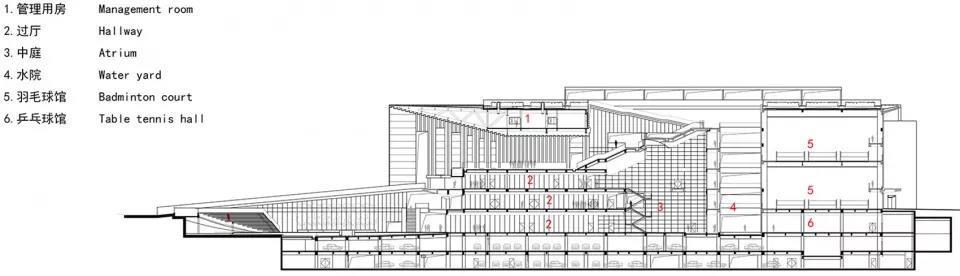 傳承中國傳統建筑中以庭院為中心的營造傳統,本項目中建筑的中心不是宏大的廳堂,而是由下沉廣場通過坡道、大臺階蜿蜒至屋頂花園的立體庭院,其中的空間與動線組織,起承轉合,步移景異,也是對中國傳統園林空間組織手法的學習和發揚。