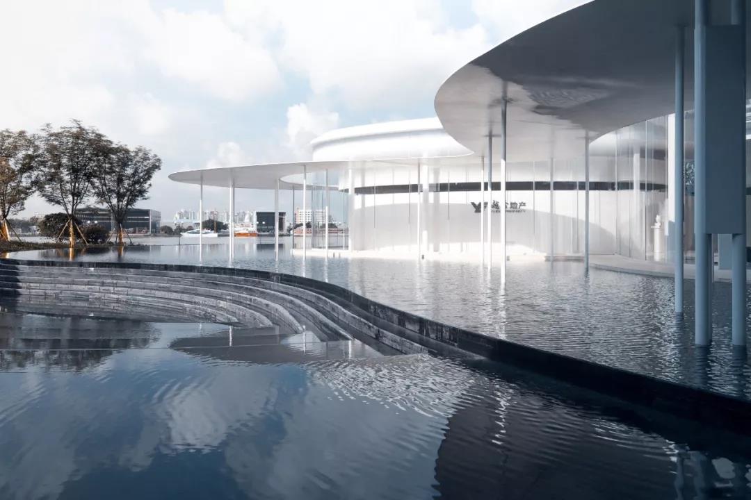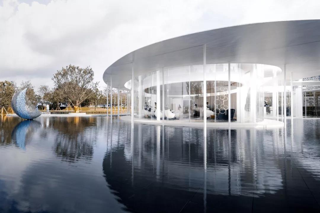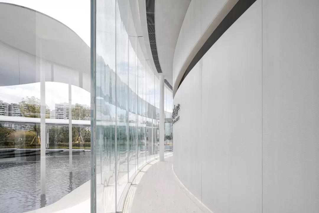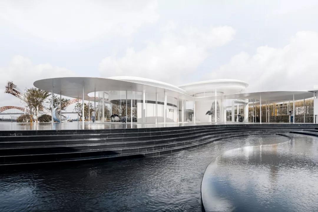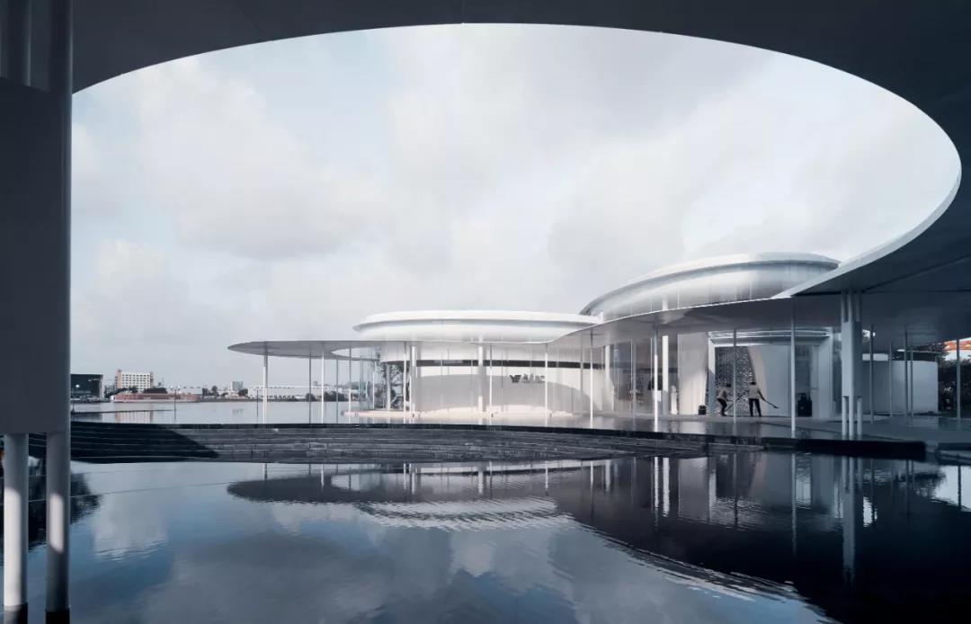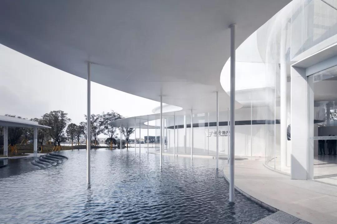 展廊主體由兩個橢圓和一個圓形相嵌合,外圈由25mm厚的鋼板飄蓬環繞,并由錯落分布的75mm直徑的鋼柱支撐。在外部,鏡面的水景,白色的反光材料,配合纖薄的實體,環境和陽光被柔和地反射進來,創造一種勻質、連續、透明的感覺。