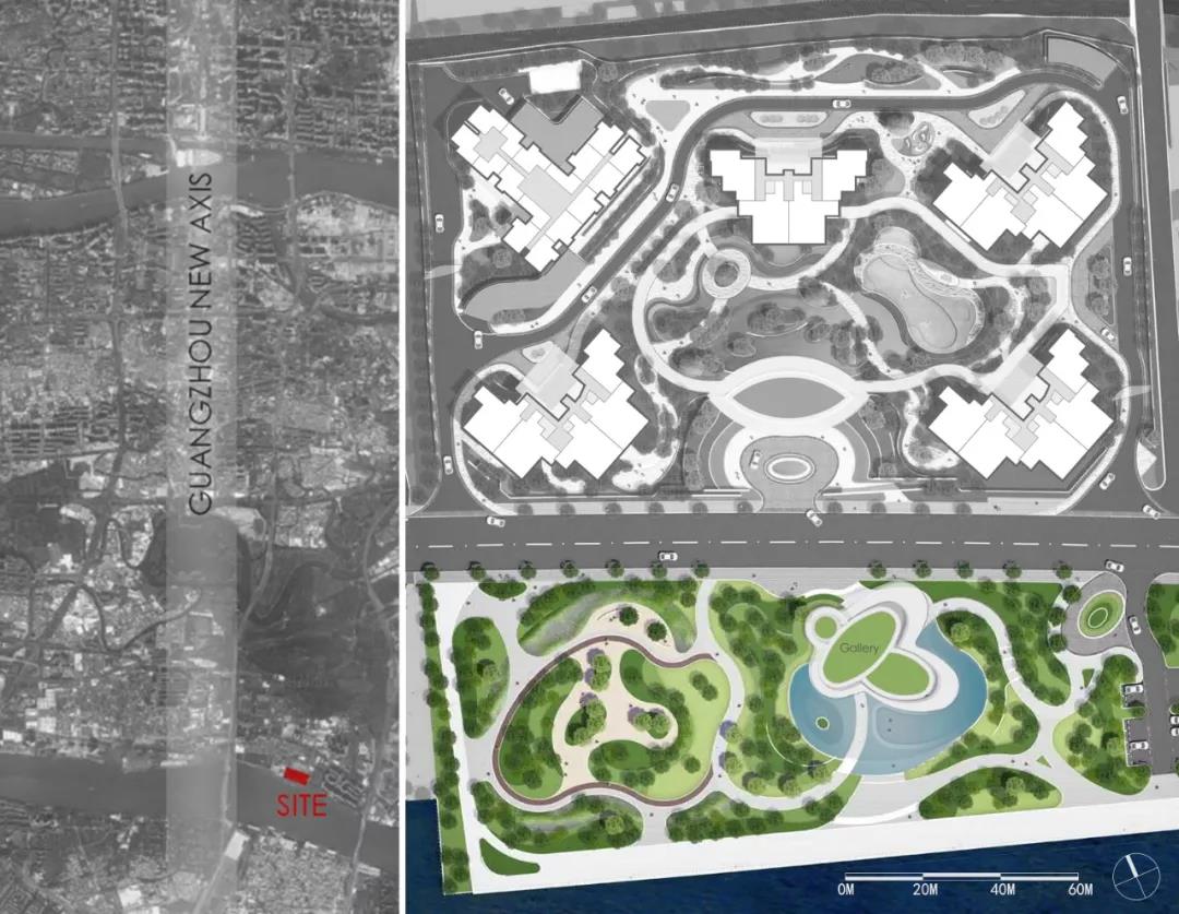 南洲路1026號地塊位于廣州新中軸線南段,海珠區新光大橋東北側,由南邊的濱江綠地以及北面的住宅用地組成。南側的一線臨江公共綠地,由業主主導,在政府的同意下建設一個濱江公園。其中,包含一座為市民開放的公眾展廊。目前展廊已竣工,將于近期面向公眾展示。