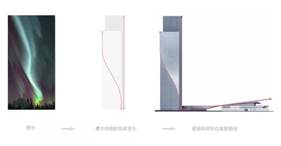 “項目面對廣場這一寬闊的開放空間,本身具備成為標志性塔樓的有利條件。而大扭擰角度的幕墻可以在第一時間抓住所有人的視線?!表椖吭O計師韋業啟(Ken Wai)從極光這一絢麗而少見的發光現象中汲取靈感,將辦公塔樓南側與東側立面頂底相連,以獨特的雙曲面模擬極光弧幕狀優美的姿態,上演一場“光之舞”,從不同角度可以欣賞到不斷變化的曲面形態。
