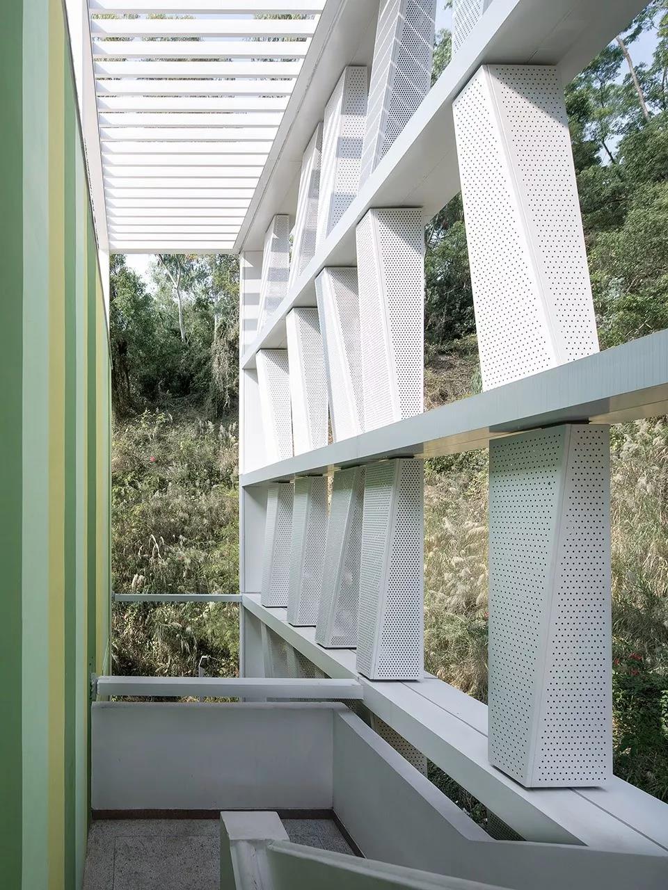 另一方面,原有的二層和三層的瓷磚墻翻新成涂料墻,四種綠色形成的豐富條形圖案與周邊的綠樹相得益彰。而白色的幕墻立面讓建筑保持謙遜的姿態的同時,內側的綠色外墻透過幕墻若隱若現。