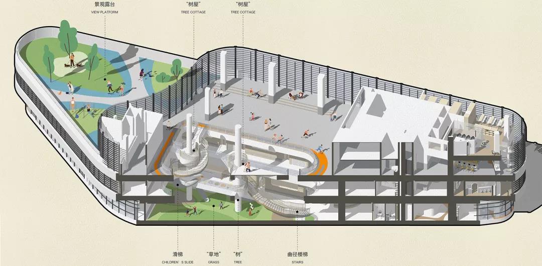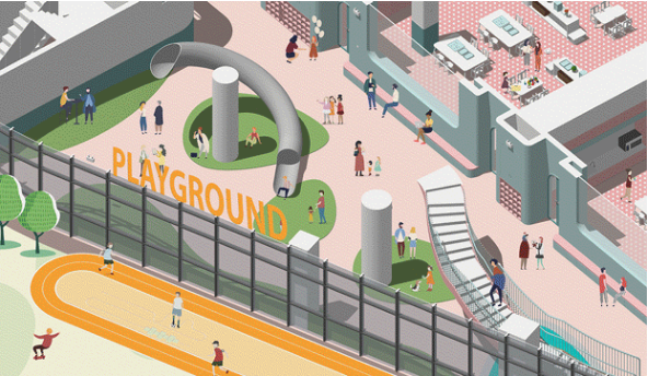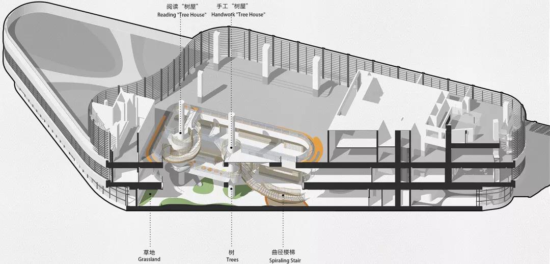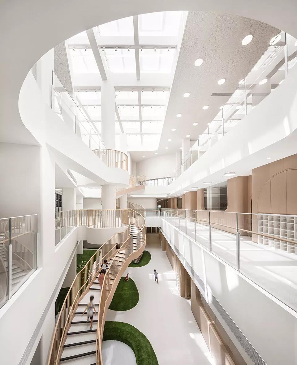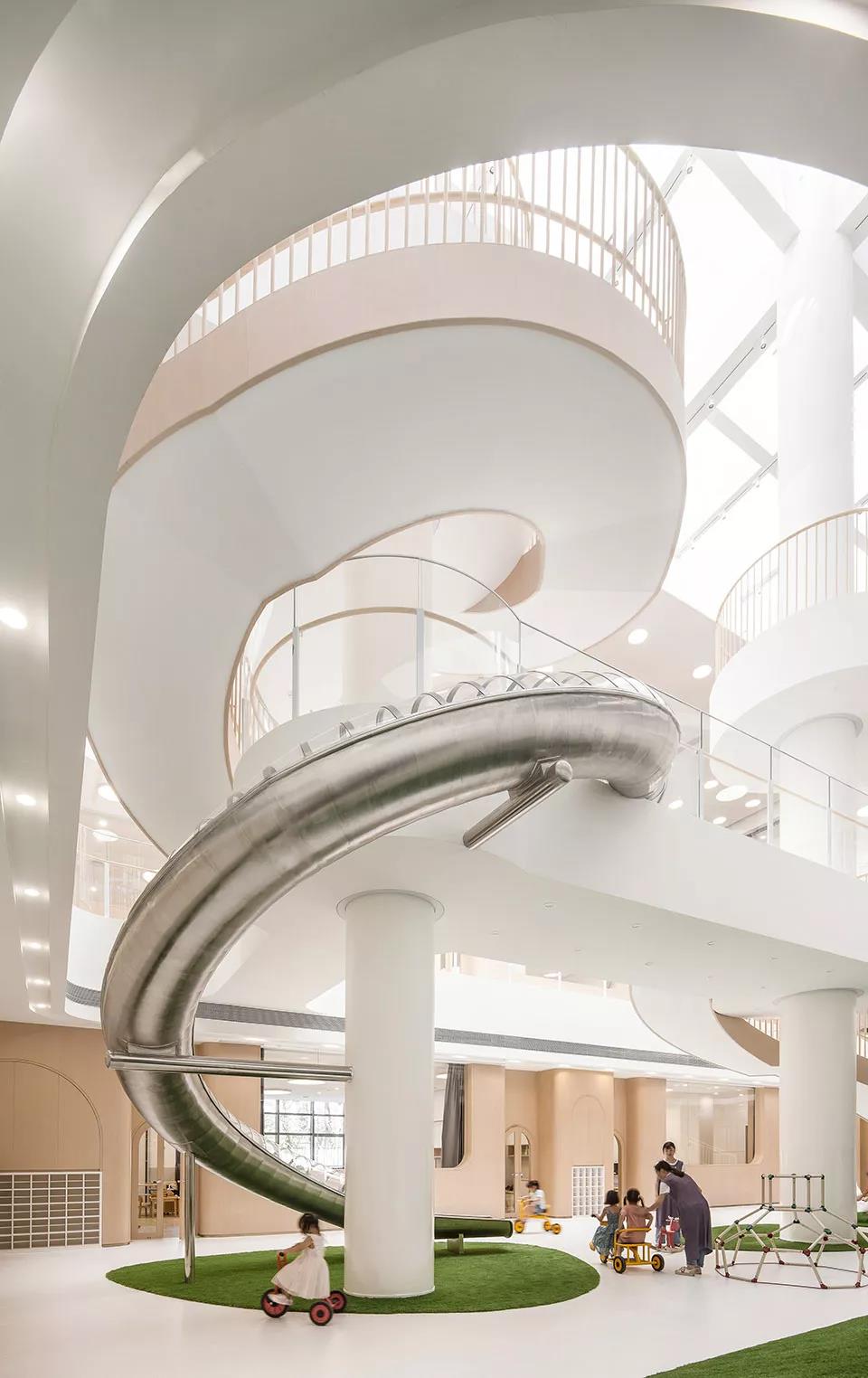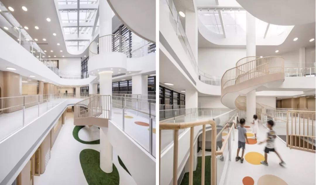 全園所有空間均采用了圓弧形倒角設(shè)計(jì)最大程度避免了各類尖角所存在的安全隱患,孩子們可以恣意奔跑,不用擔(dān)心磕碰。三層成為室內(nèi)外結(jié)合的大活動(dòng)場(chǎng)地,跑道從中庭衍生出來(lái),利用連續(xù)自然的曲線劃分出不同主題活動(dòng)區(qū)域,并通過(guò)塑膠跑道串聯(lián)起所有室內(nèi)外活動(dòng)。