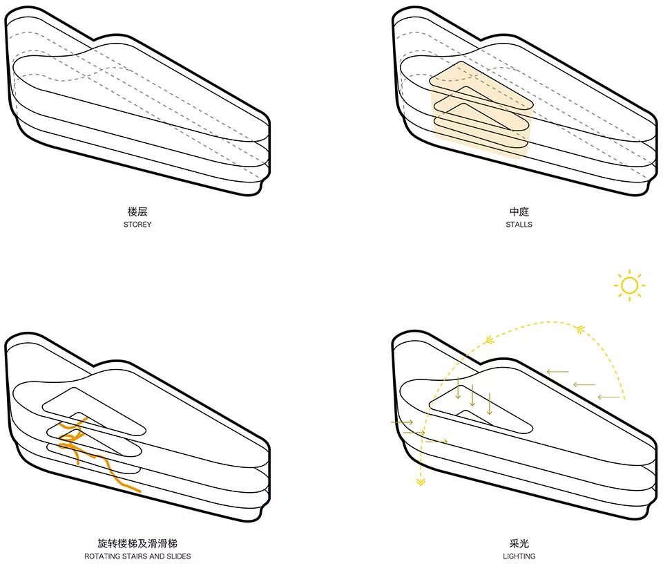 在兒童的成長(zhǎng)過(guò)程中,陽(yáng)光、泥土、草地幾乎是最重要的物理空間要素。出于結(jié)構(gòu)穩(wěn)定和加固成本的考慮,立木保留全部結(jié)構(gòu)的基礎(chǔ)上打開(kāi)了一個(gè)貫穿三層的中庭,確保所有教室實(shí)現(xiàn)雙面采光,不再依賴人工照明。