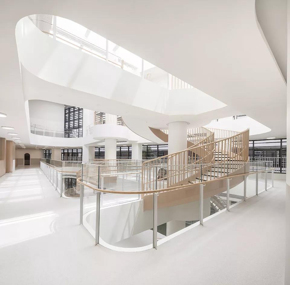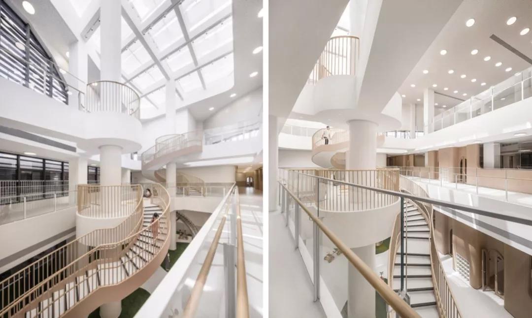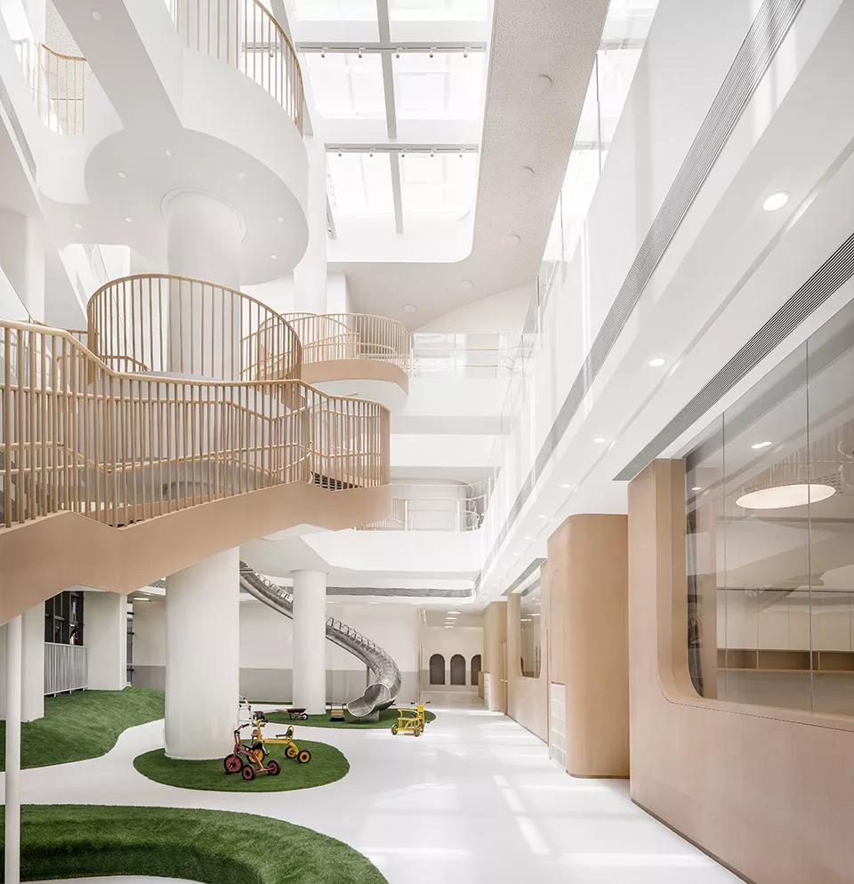 中庭利用保留結(jié)構(gòu)將“小樹(shù)林”搬進(jìn)了“郵輪”里,上下奔跑,在自然里穿梭。柱子成為樹(shù),梁成為橋,連續(xù)的樓梯和滑梯圍繞“樹(shù)”盤旋而上,激活各層空間。樹(shù)屋平臺(tái)作為閱讀角和手工角,是小朋友的專屬空間。全園以淺木色為整體基調(diào),大面積的超白透明夾膠安全玻璃創(chuàng)造出純凈、公平、寧?kù)o的空間環(huán)境。