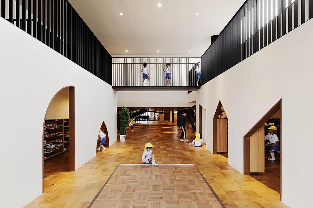 ▼幼兒園入口,兩側墻壁開有不同幾何造型的門洞