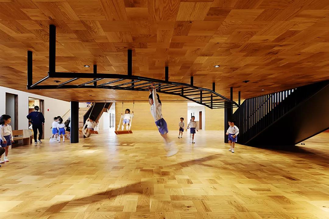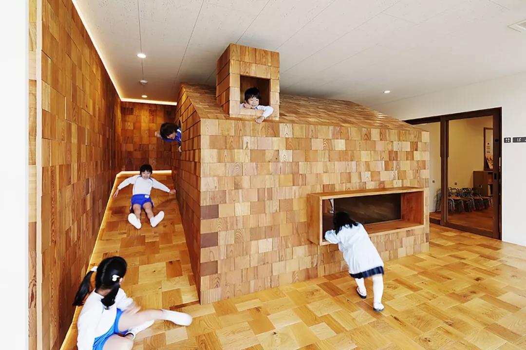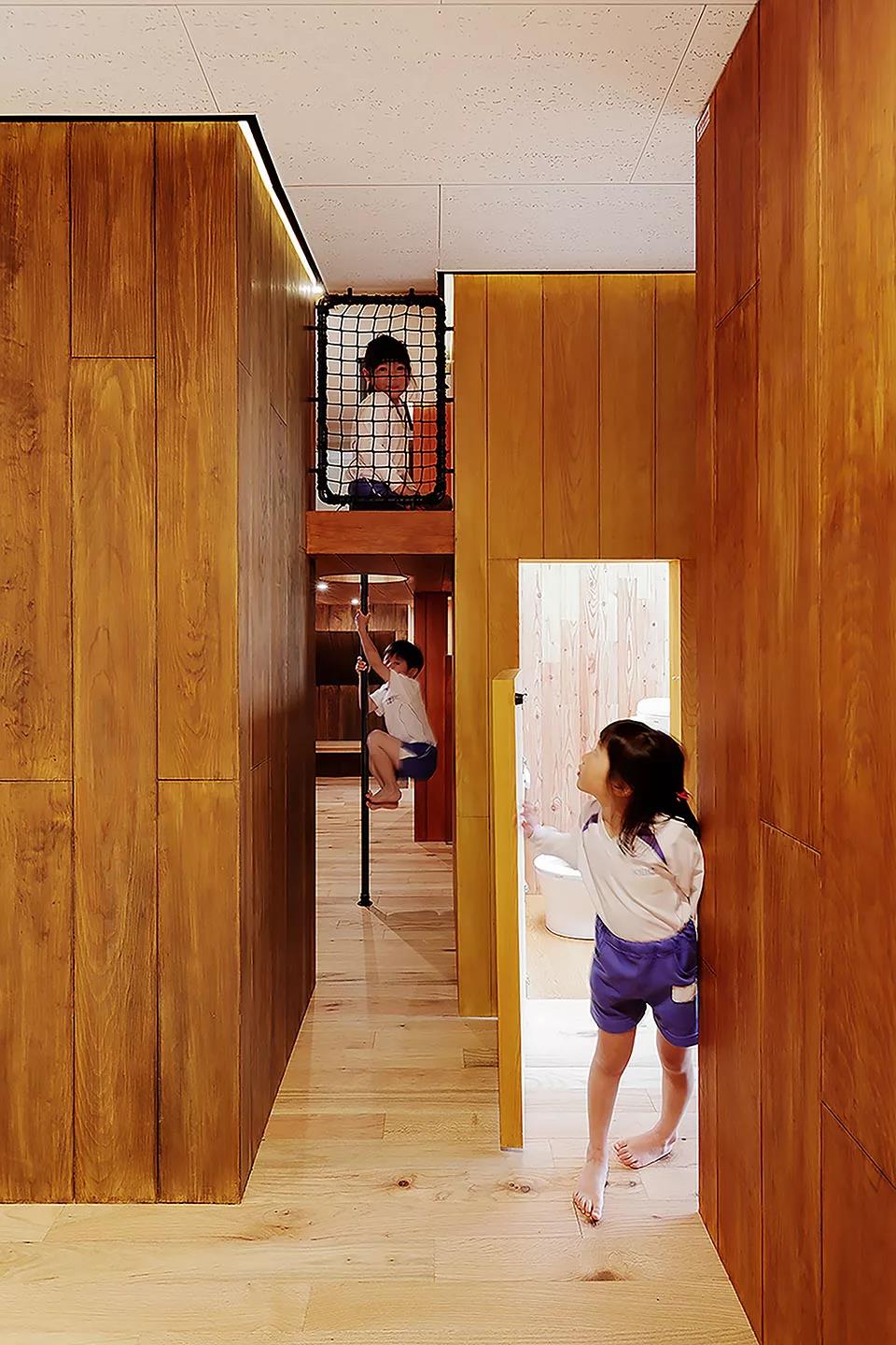 設計故意將職員室和保育室等空間上下左右錯開,富含變化的空間設計使得新的空間被創造。以孩子們游戲的原風景「路邊」為形象,在園舍中設置了14個游戲場所。