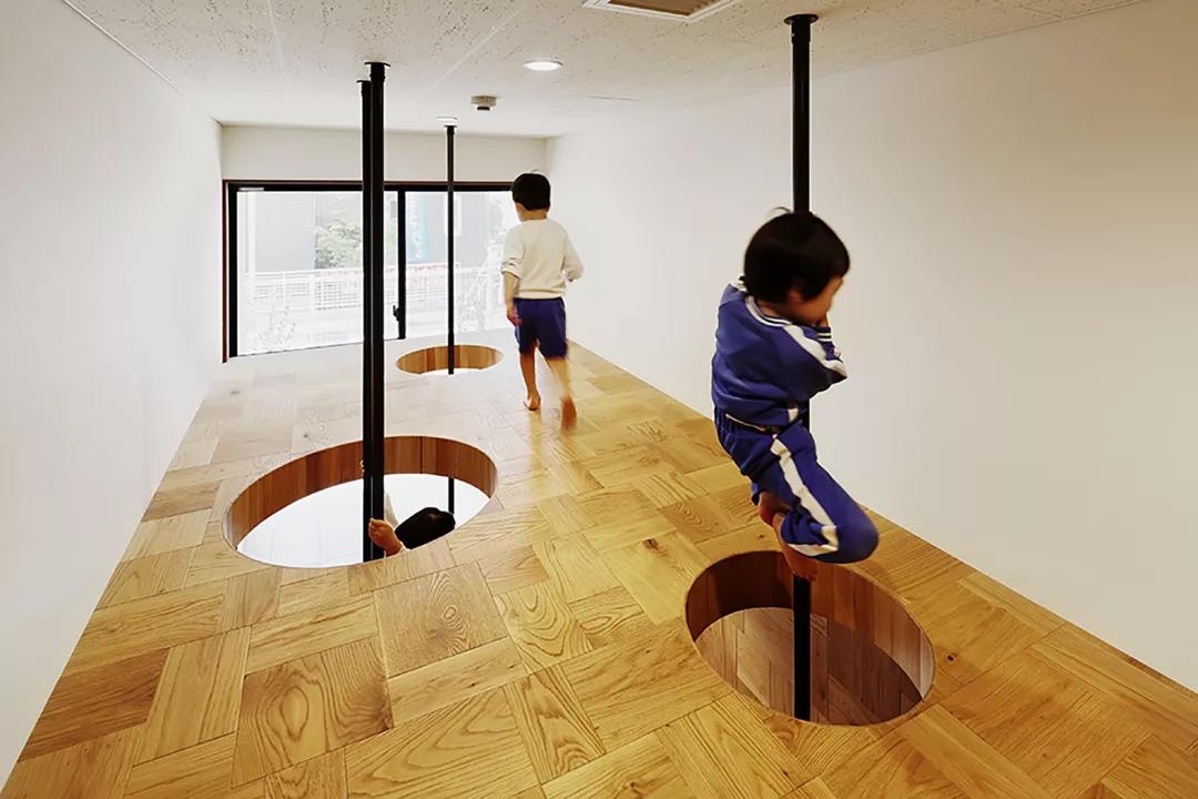 像這樣在園內外設置能引發身體做出相應動作的游戲場所,不僅孩子們的運動量自然而然增加,體力得到增強。這樣的空間還讓孩子們升起創造游戲的欲望,刺激好奇心,是孩子們能健壯成長的培育環境。