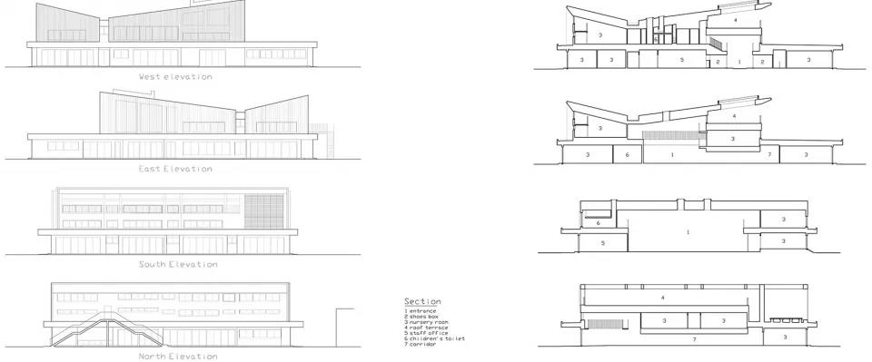 這是愛媛縣松山市的新建幼兒園項目。近年,地方城市以車代步。孩子們上學放學由汽車迎送變得平常,孩子們在日常生活中活動身體的機會減少。由于手機游戲的普及室內游戲增多,孩子們自己在室外擁有豐富變化的環境中創造發現游戲的機會也被剝奪。在這樣的現狀下,以「通過游戲培育健康身體的園舍」為概念對KO幼兒園進行了改造計劃。
