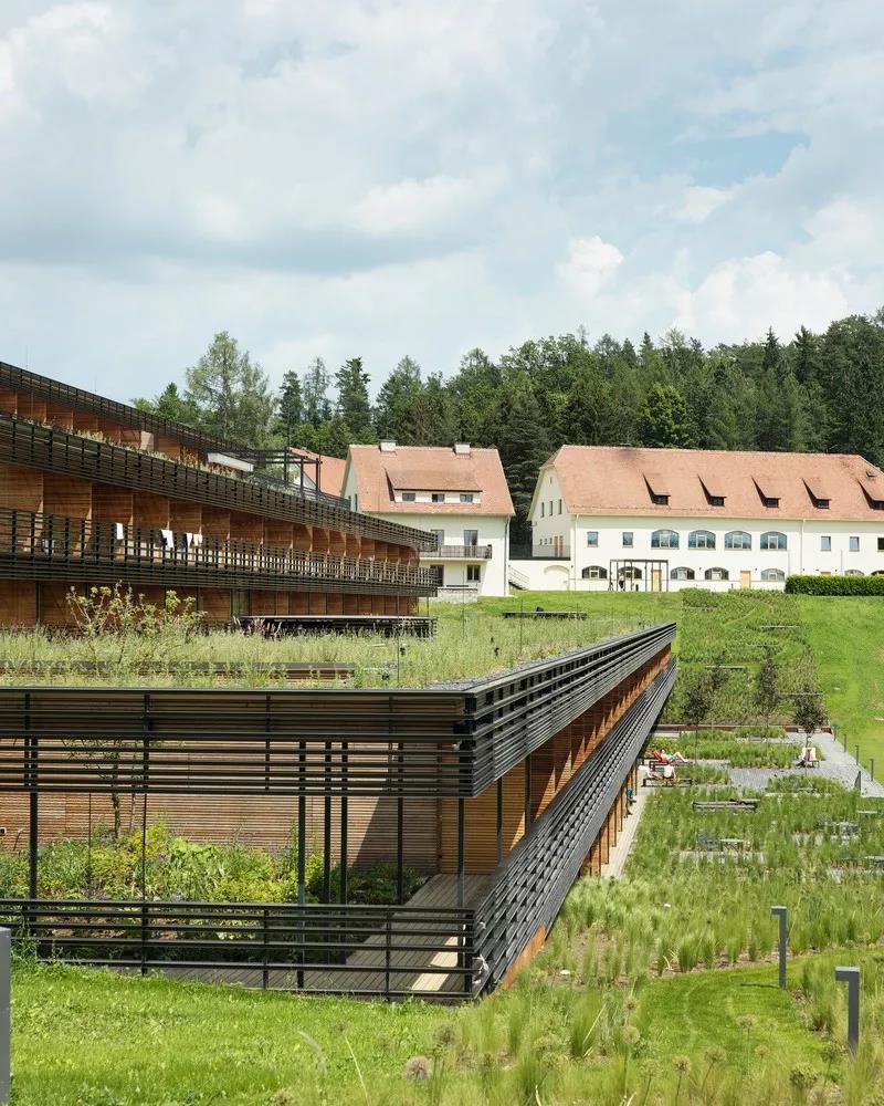 為了讓景觀滲透到建筑之中,建筑師設計了種植果園草地的中庭。S山及其周圍的丘陵森林和草地的景觀是Josefhof空間布置的主要影響因素。入口區域、餐廳和酒吧提供了朝南和朝北的視野。底層結構交錯排列,讓屋頂與上層建筑的圍墻底端平行。