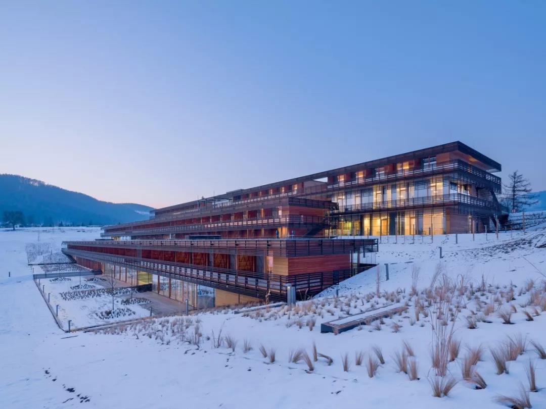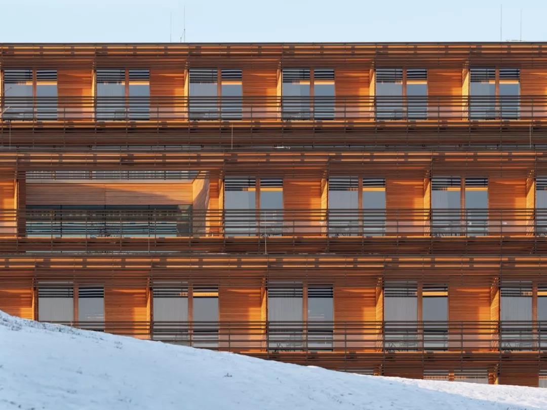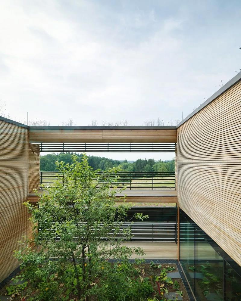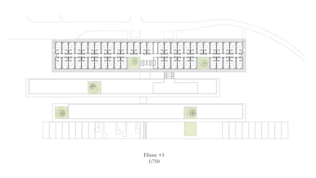 這些房間由木材模塊組成,內部裝飾完善后交付給建筑工地。房間由自然材料主導,強調療養中心中設施的重要性。貫穿建筑的景觀也使用了自然材料。天花板上的明確而經濟的柱網作為建筑的承重組件。