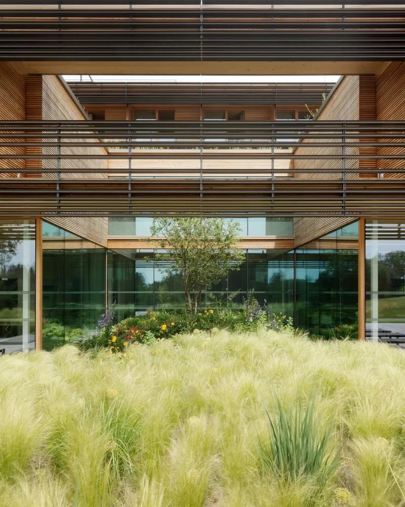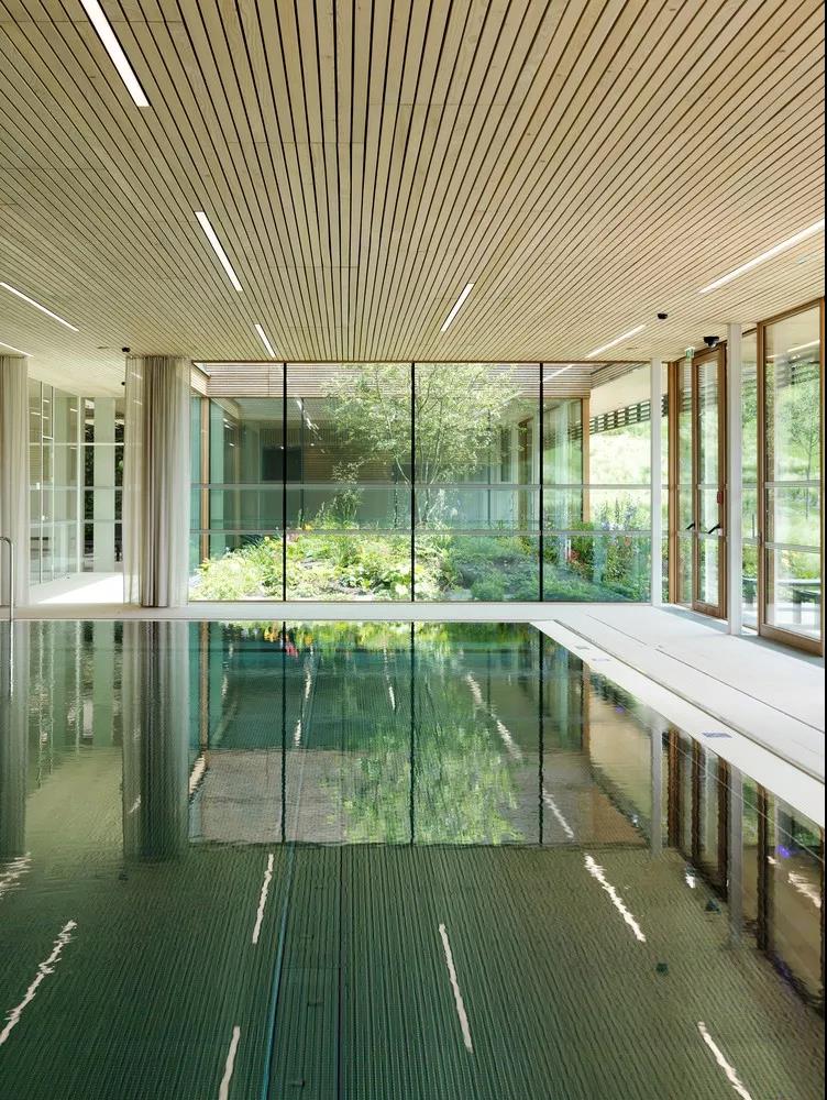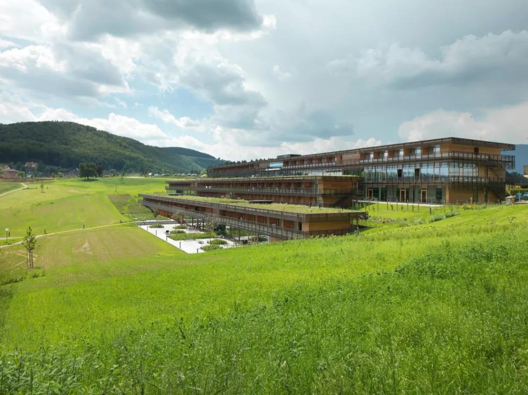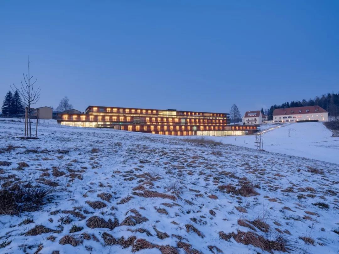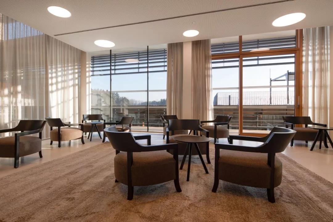 自然地形的景觀在結構之間延續。所有房間都有良好的文化景觀視野。研討會區和繁忙的初級保健診所不僅擁有良好的景觀視線,還提供了通往自然的便捷地面出口。沐浴和桑拿區位于建筑南部的地形基礎之上,在那里可以欣賞木屑小徑與池塘景觀。