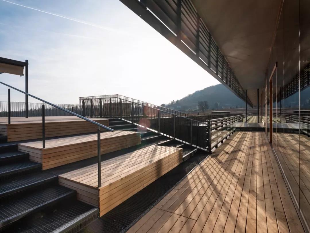 該項目將建筑與景觀融合在一起,旨在為該地區創造人與自然之間的和諧氛圍。設計場地屬于該地區典型的果園草地。三個狹長的結構被設置在類似競技場的場地中,使得建筑有時看起來像是盤旋在地面上,有時則是嵌入到地形中。
