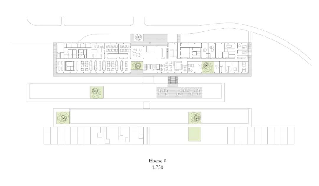 從接待大廳開始,所有區域都是無障礙的,可以讓人們快速進入。與立面相反,簡單緊湊的窗戶結構被遮擋,避免了太陽直射。最佳隔熱立面和背陰的中庭滿足了建筑的能源需求。建筑的承重結構采用高度預制化這一十分經濟的建筑方式。