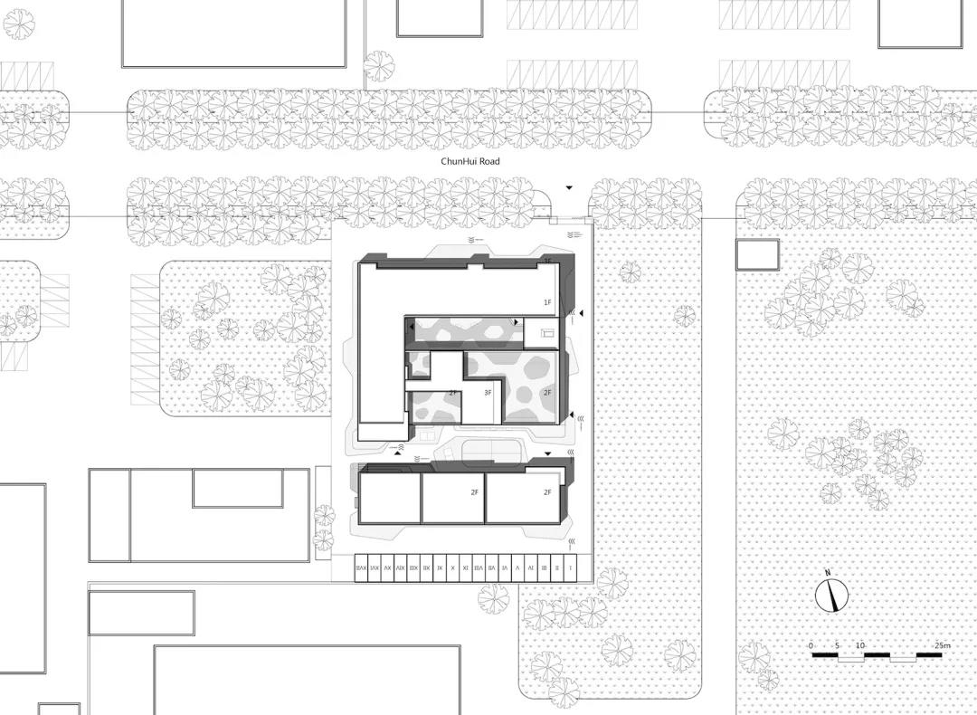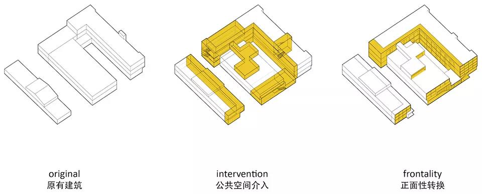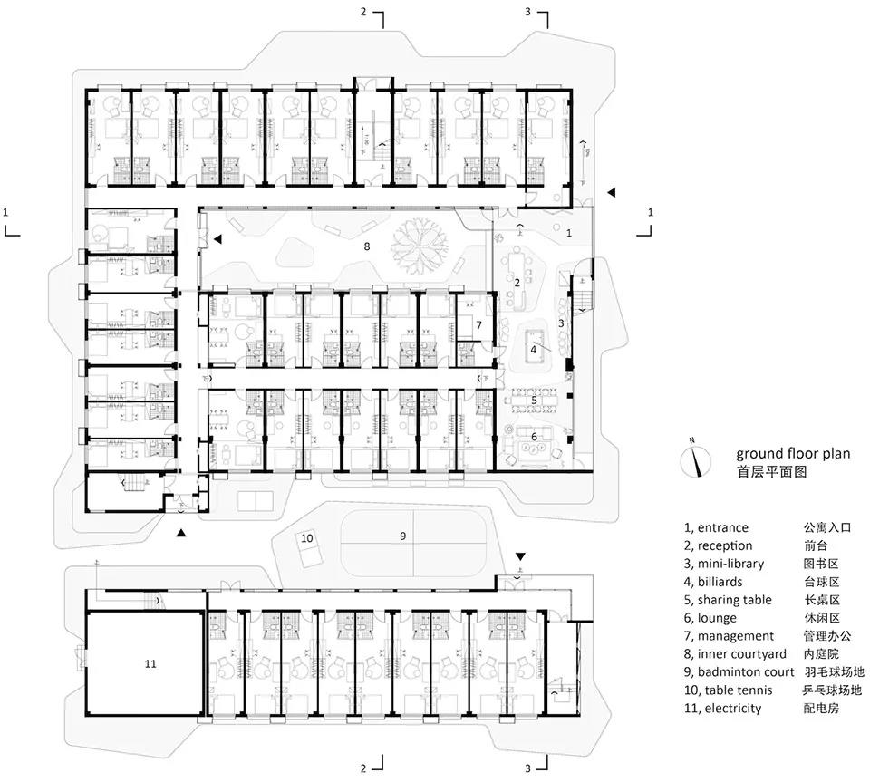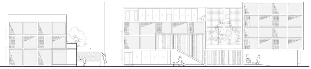 場地北側的春暉路上,兩排郁郁蔥蔥的行道樹幾乎遮擋了整個建筑沿街立面,而場地東側面對的是培訓學校的開闊綠地。于是我們大膽地將立面的主次關系調整,將面對東側開闊場地的一面作為建筑主立面:建筑首層在東側打開,作為整個青年公寓的客廳和公共活動空間;原有場地上的三棟建筑的東側山墻面也采用統一、連續的方格子形式語言作為青年公寓的主要外部特征。