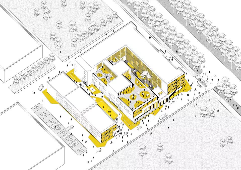 ▼北側三層高的建筑加建了一條外走廊來串聯各部分的公共交通