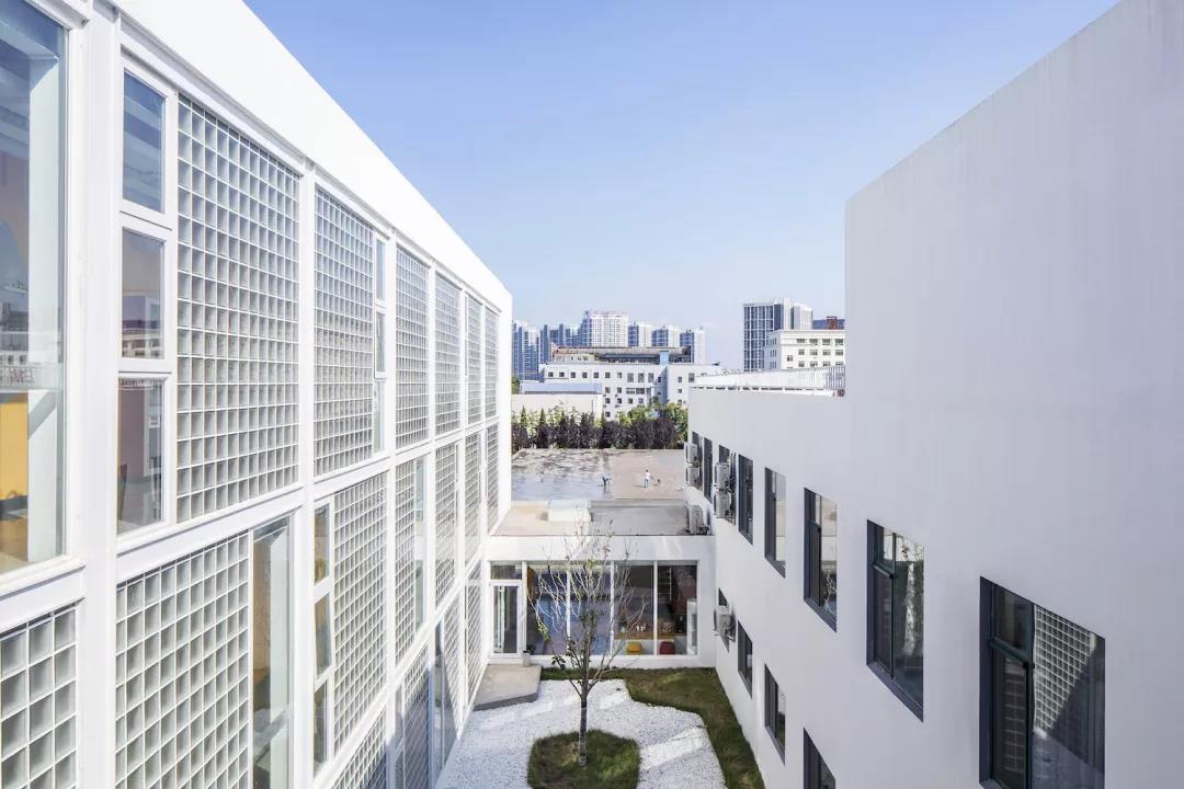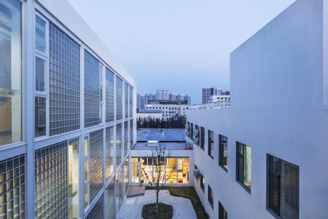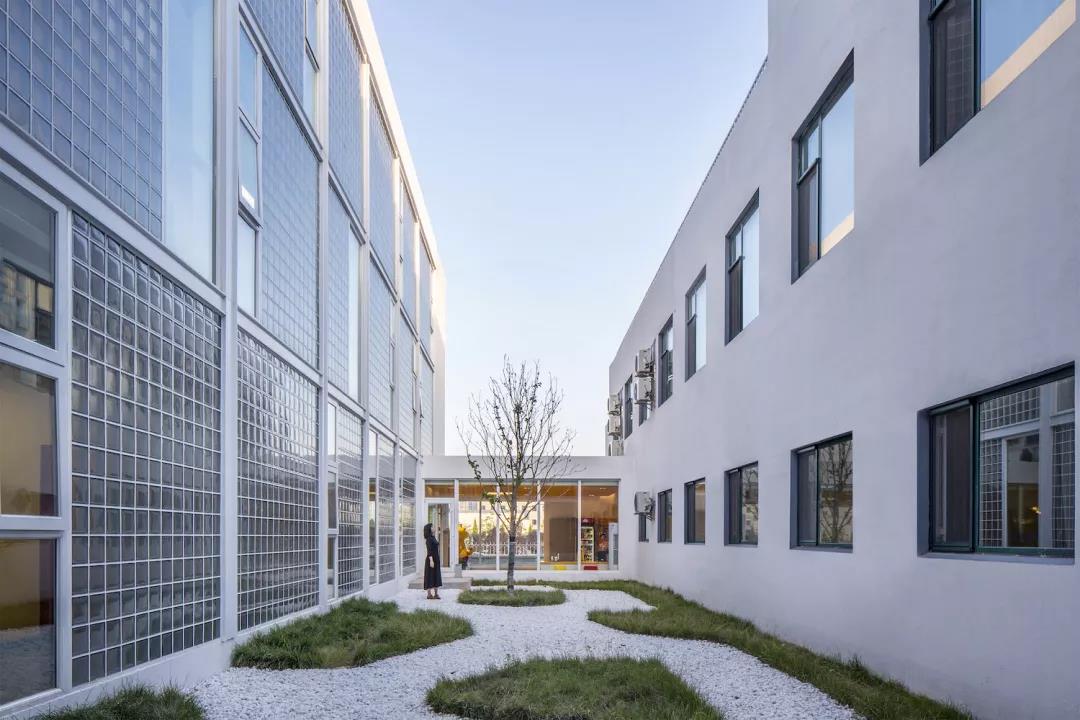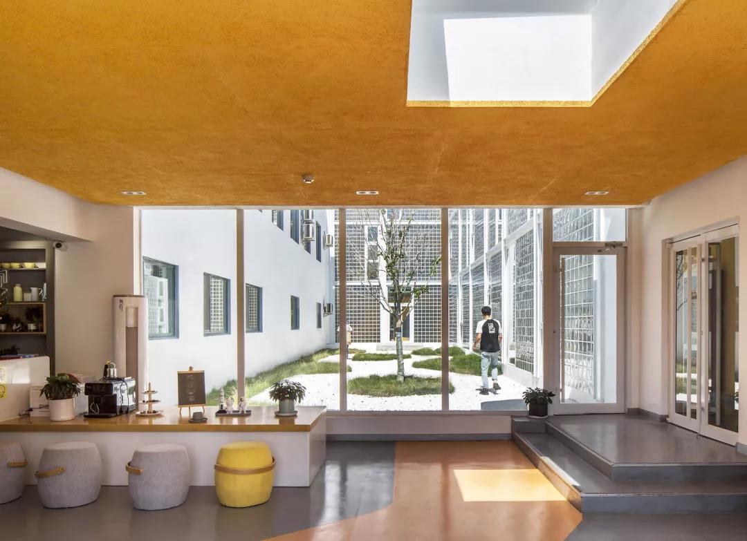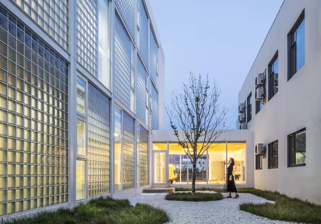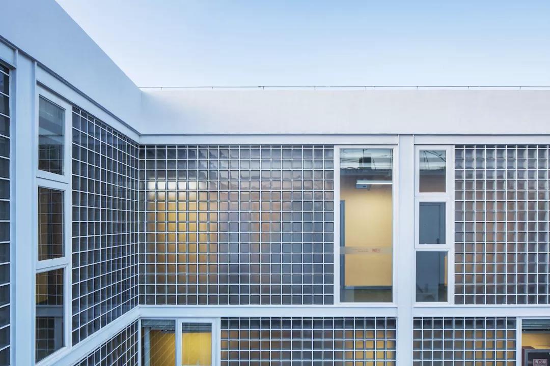 ▼走廊的外墻面為極具文藝氣質的玻璃磚,半透明的玻璃磚墻和新增的入口門廳一起形成了一個內向的靜謐庭院