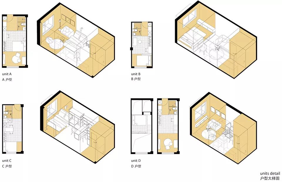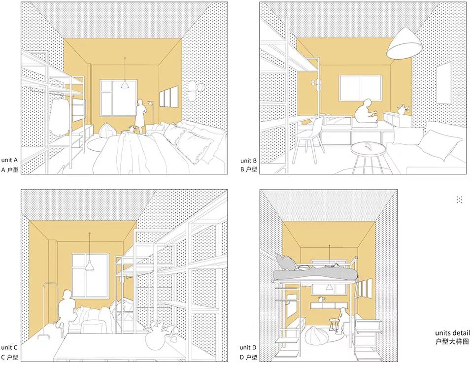 公寓部分共102間,因原有建筑的不同柱網尺寸產生了5種戶型,進深從5.6米到7.6米不等。公寓單元的空間設計根據進深不同分成了三到四個模塊分區,依次是入口/衛生間、起居空間、睡眠空間、以及延展工作空間,每個部分采用不同的墻面色彩和家具搭配進行區分。原有倉庫建筑的二層較高,因此設計中還加入了LOFT戶型,讓起居和休閑空間與睡眠空間垂直分離。公寓單元的這種系統化的處理方式加大了套內的空間感,同時也通過明確的功能分區提升了居住空間品質。