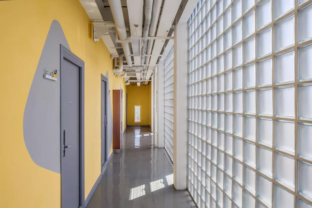 加建的走廊面向安靜的內庭院,其立面材料主要是半透明的200mm見方的玻璃磚。白天,柔和的光線透過玻璃磚照進建筑走廊和樓梯間,明亮并且舒適,如果身至庭院里,則會時常看到走廊里有人經過的光影浮動;夜晚,室內照明點亮了走廊和公共區域的橙******墻面,淡淡的鵝黃透過玻璃磚滲透出來,像溢出的橙汁,給年輕的人們家一般的溫暖感受。