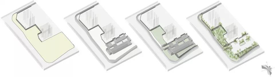 這是一處市政森林公園旁的社區街角空間,5623㎡的L型地塊。建筑在短時間內,是萬科的住宅示范區,未來將作為社區幼兒園。毗鄰森林公園,我們希望將街角的景觀與城市融合共生,還原公園的日常情景。與業主方達成一致之后,我們決定在此處打造一個充滿森林趣味的街角公園,并永久地開放給城市市民。