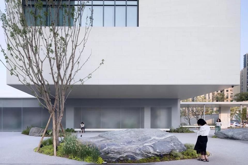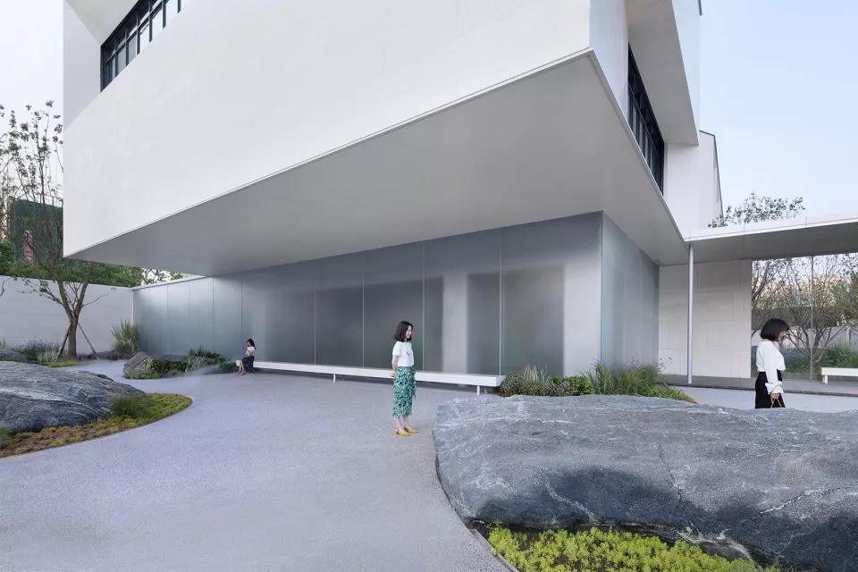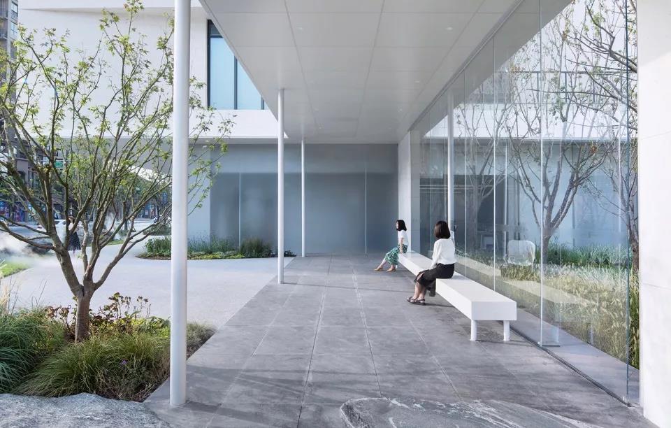 ▼利用圍墻形成開放的景觀廊架,玻璃立面向行人展示建筑內景觀