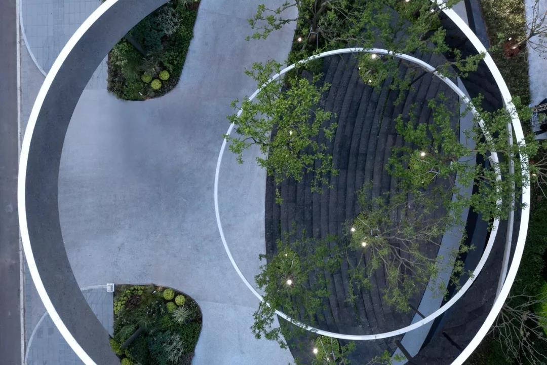 星光圓環是場地設計的一個亮點。一大一小,一厚一薄的兩個圓環,限定出公園入口的界面。圓環的頂點離地面6米,夜晚在空中形成一條星光密布的光帶,穿行在烏桕林中,成為這個小公園的標志。大圓環的內側為360°鏡面,把懷抱其中的幾株烏桕無限次的反射,形成無窮盡的森林意向。