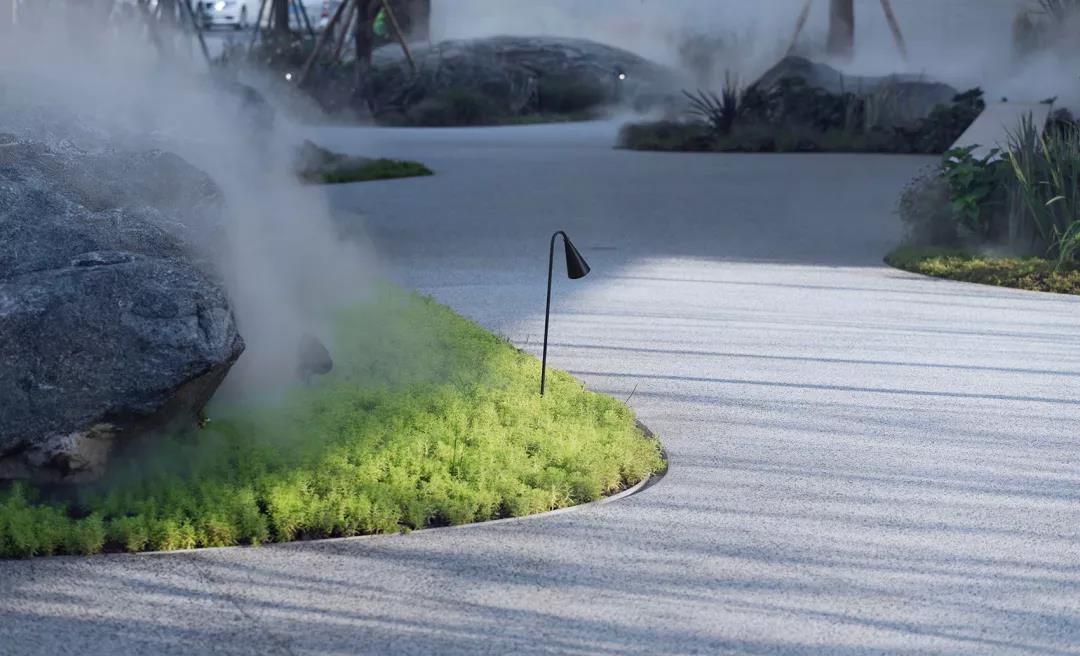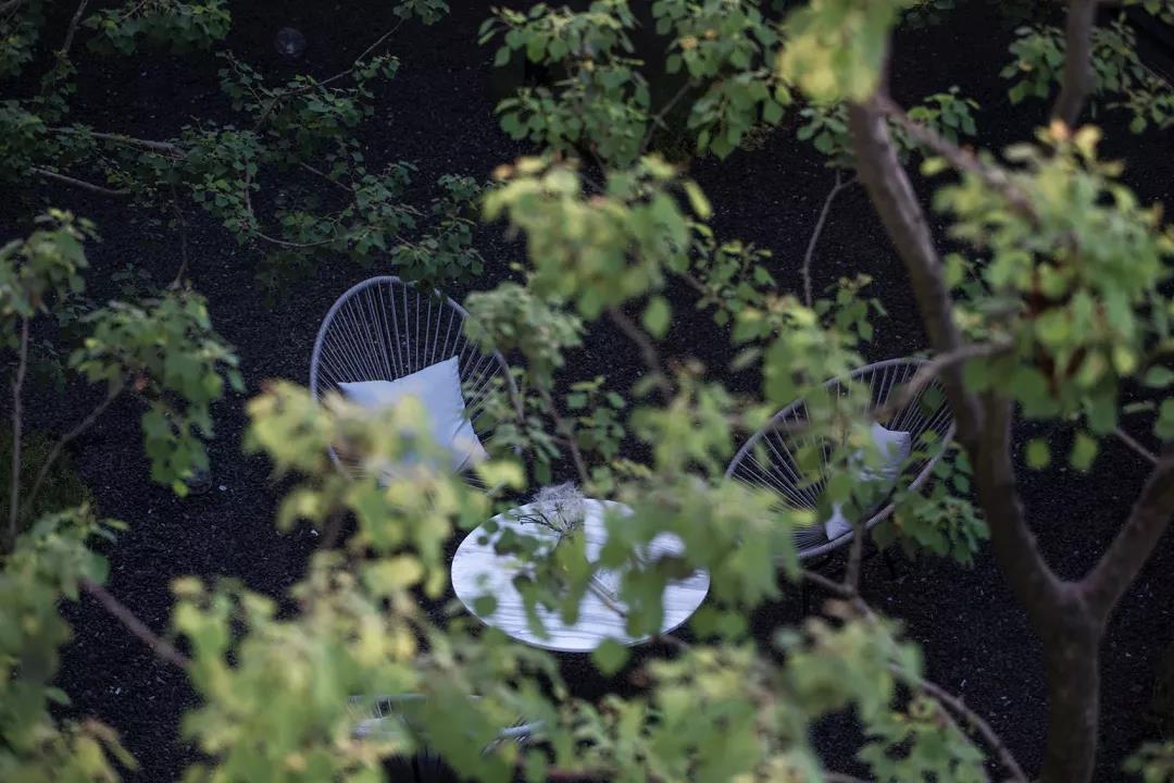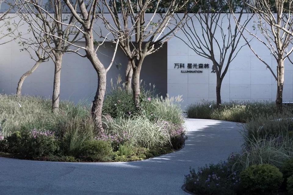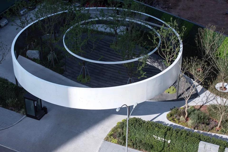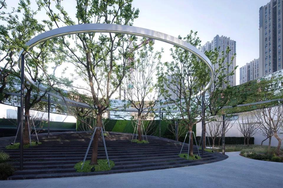 林下庭院由一片烏桕樹和一個模擬的小山體以及一個“星光圓環”構成。烏桕林以4-5米的間距種植,以便林下的空間游人可以自由穿行,甚至孩子也可以奔跑嬉戲。模擬的小山體以森林公園拾級而上的臺階為元素,樹木穿梭其間,小草從石縫中長出,一方面解決居住區圍墻與小公園之間的視線落差,也形成了獨特的視覺記憶和空間體驗。