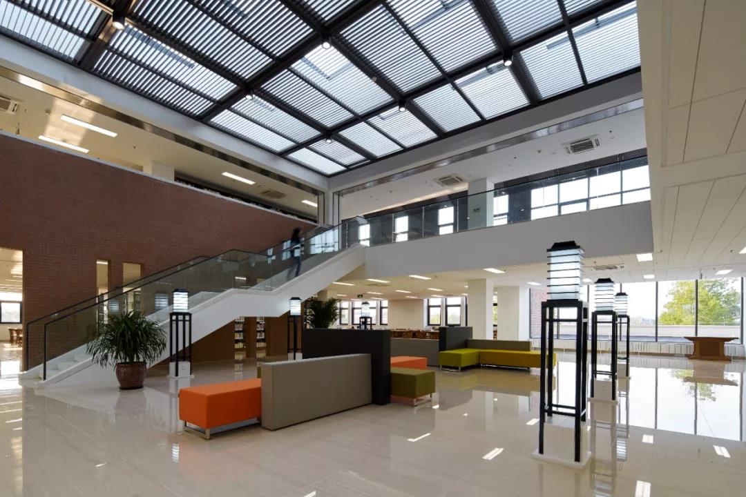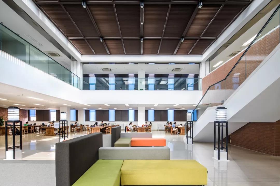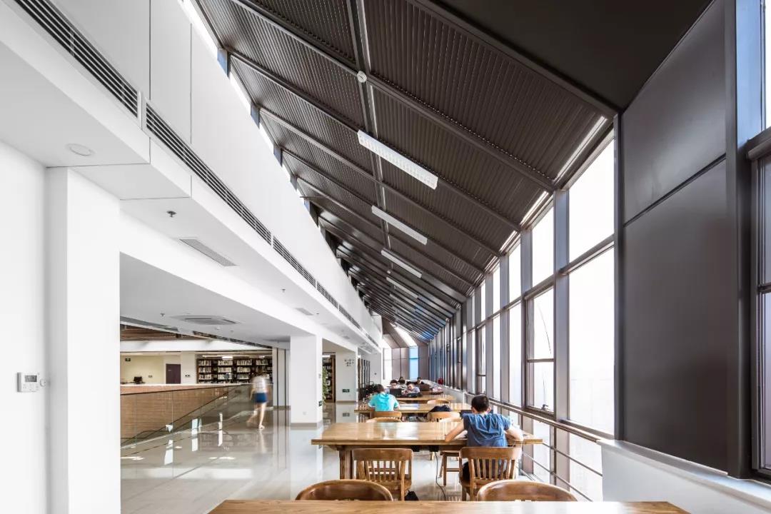 設計充分體現(xiàn)了當代高校圖書館發(fā)展的趨勢,在功能上補充了圖書館大開間閱覽室的不足,增加展廳、咖啡廳、開放書店、小組討論空間、研修間、古籍修復區(qū)等新功能。同時在不同標高層設置若干貫通數(shù)層的公共空間,串聯(lián)起整個室內(nèi)外空間流線。