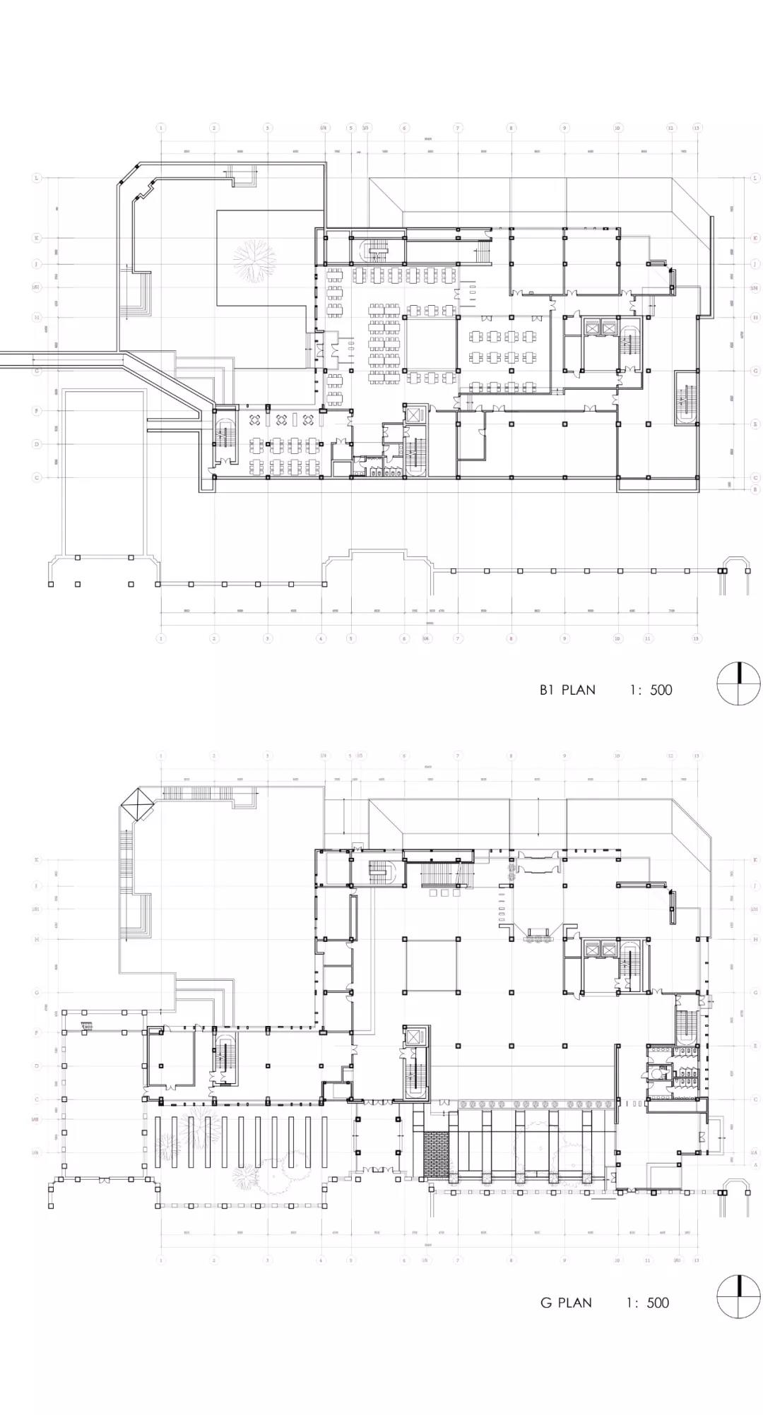 建筑基于上部逐層內(nèi)收的形體處理,在平面組織上發(fā)展出內(nèi)、外兩層的空間嵌套關系。形體與平面的設計邏輯,被真實地表現(xiàn)在建筑立面上:在最外沿3層高的通透表皮之內(nèi),包裹著保持了分隔與滲透平衡的、更具實體感的4層高的墻體。