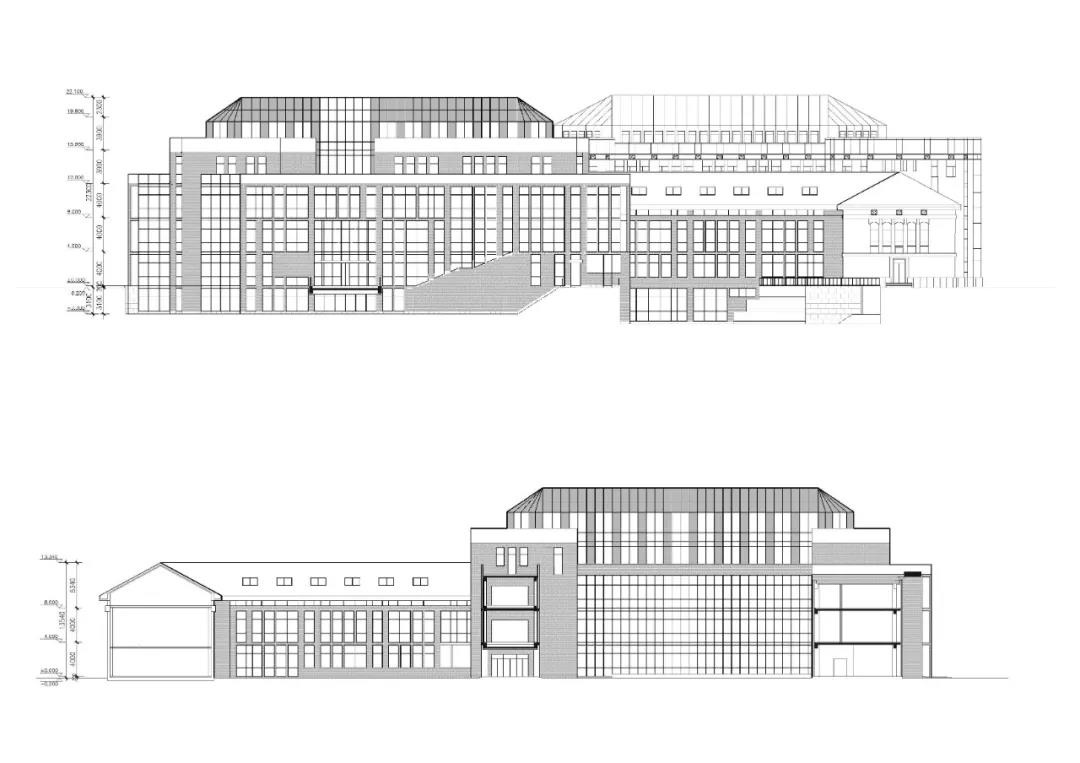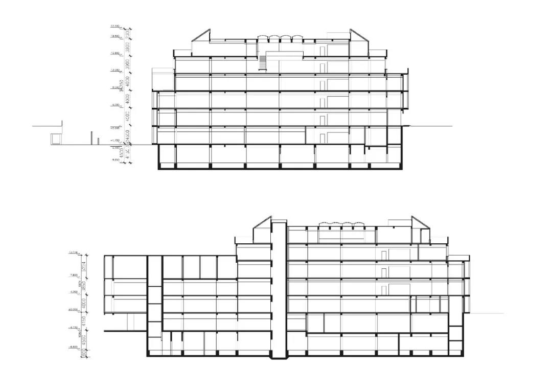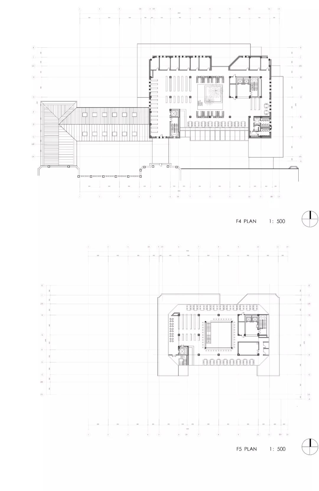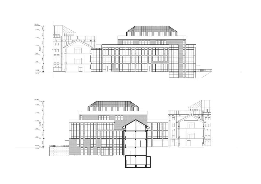 擴建部分與原圖書館內(nèi)外聯(lián)通,形成有機的整體。收進的四層外墻向下延伸,形成了1-3層平面中內(nèi)、外層空間之間的分隔界面,內(nèi)、外兩層之間通過墻體上的開洞實現(xiàn)相互流通。