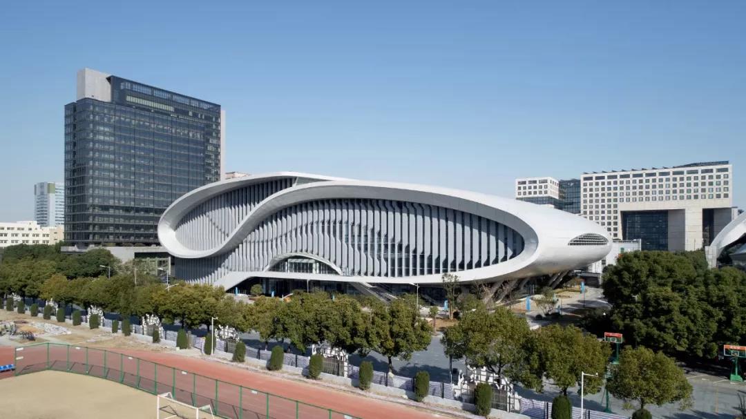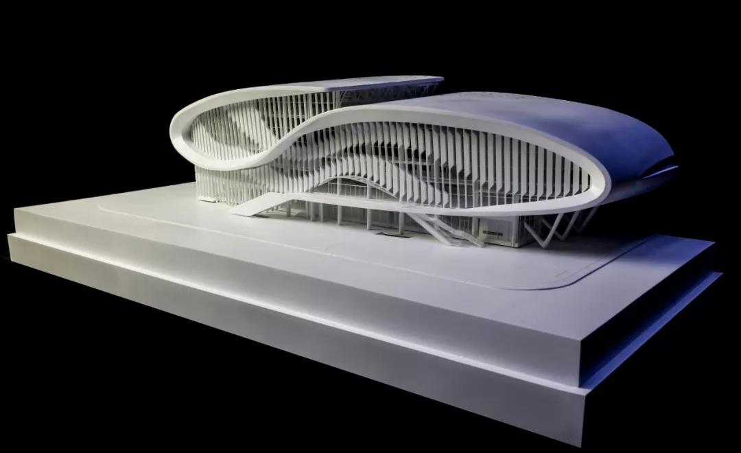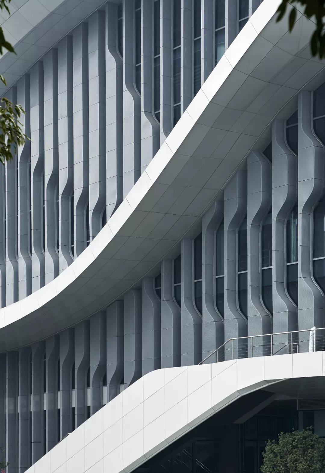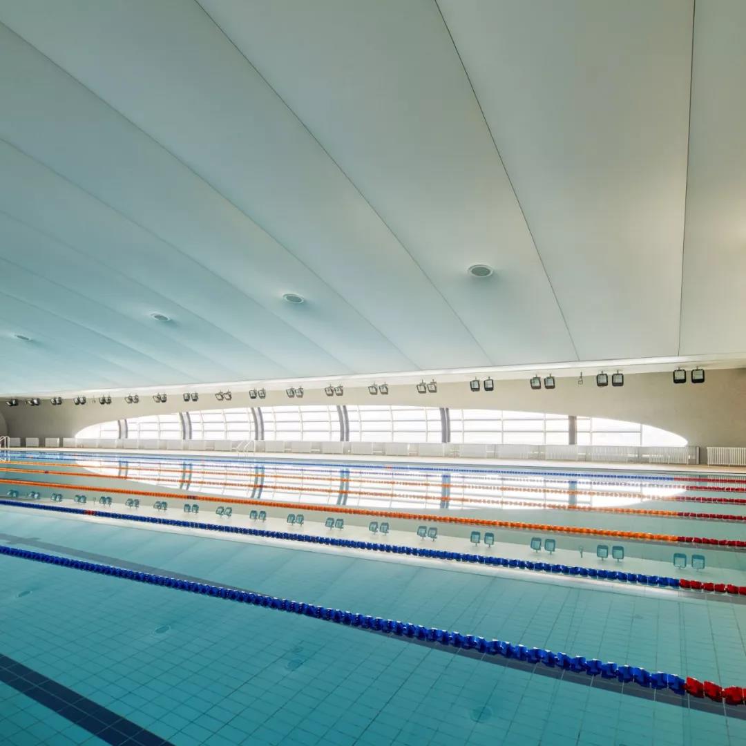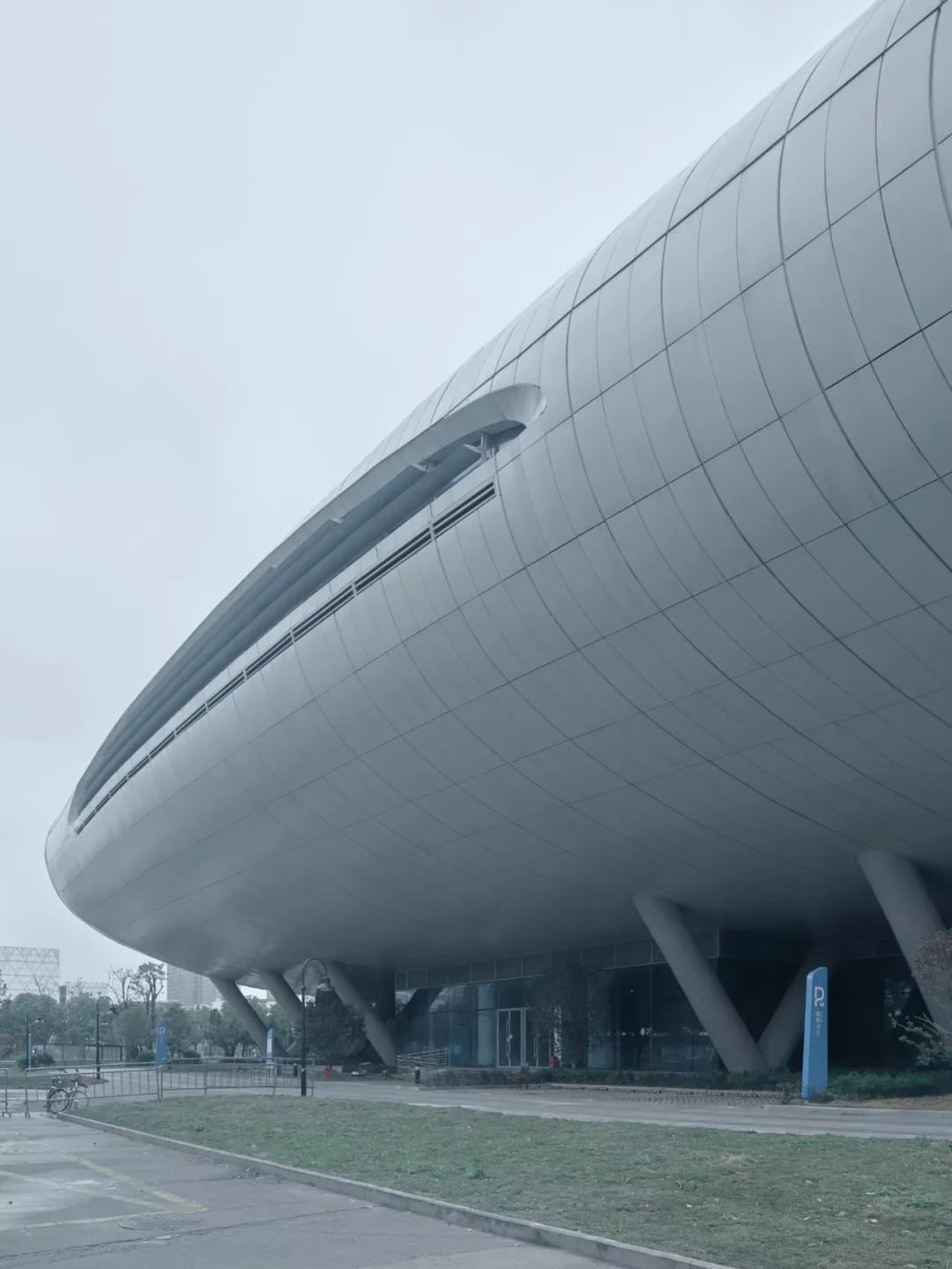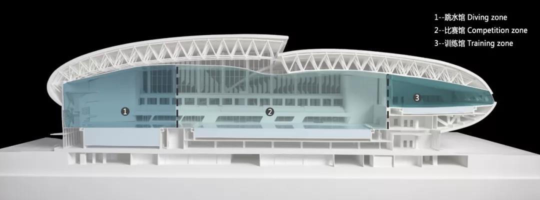 建筑輪廓依據內部空間關系自然形成高低起伏的整體形態,并通過立面檐口的自由曲線造型呈現一種未來建筑般的“漂浮感”。游泳跳水館“圓潤流暢”的自然形態,在視覺上讓人聯想到游泳比賽場上此起彼伏的波浪,建筑外部形態成為內部功能的直觀反映,進一步增強了市民對建筑的可讀性。