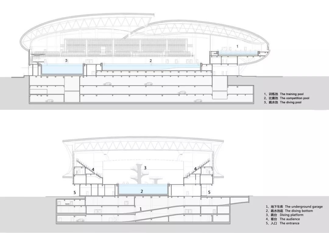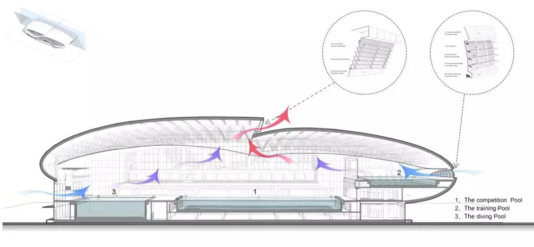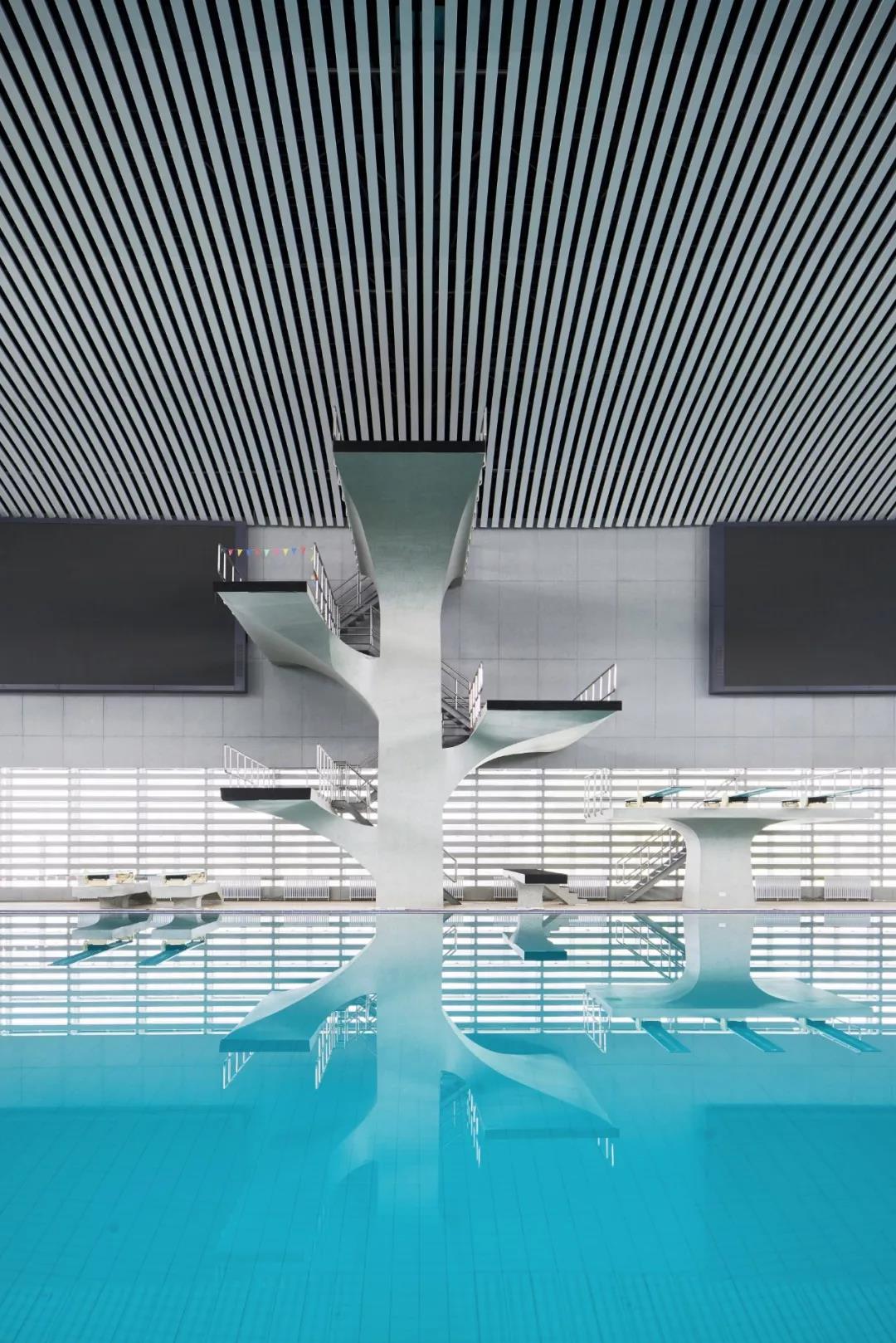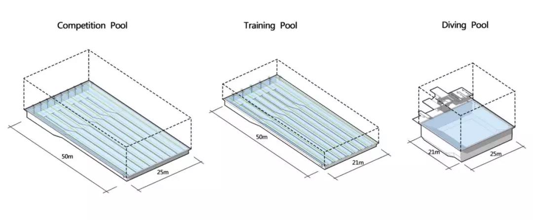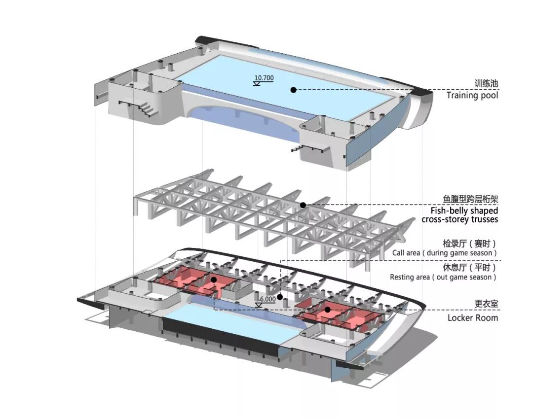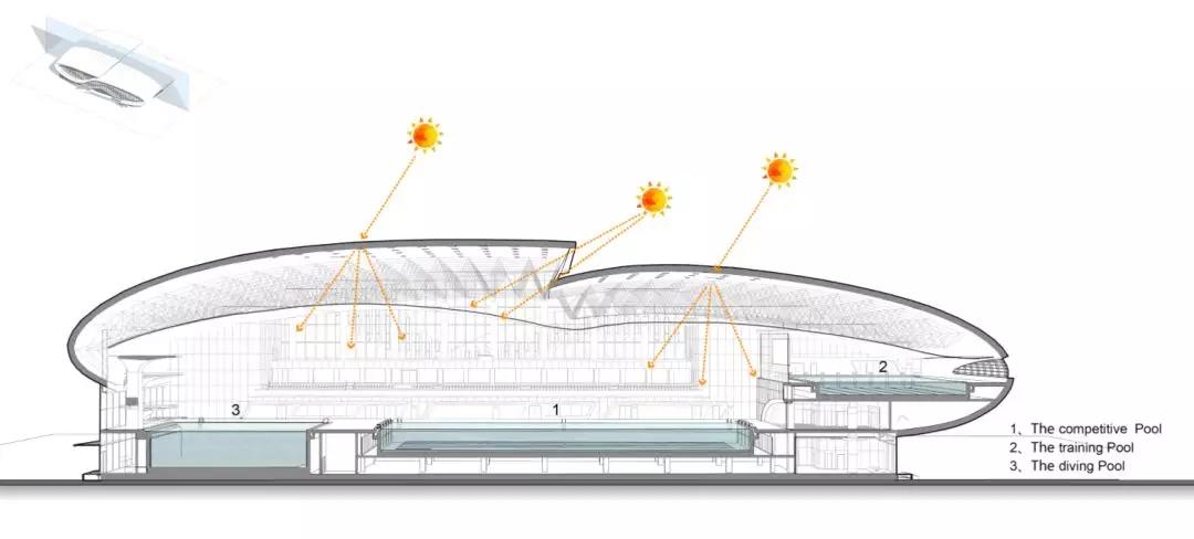 設計將游泳池和跳水池平層布置,而將訓練池架空10米,并錯層布置于比賽池斜上方。在滿足功能、流線的前提下,保證了三泳池均擁有良好的自然通風、采光條件,完成了一次巨大建筑體量與狹小用地間的極限挑戰。